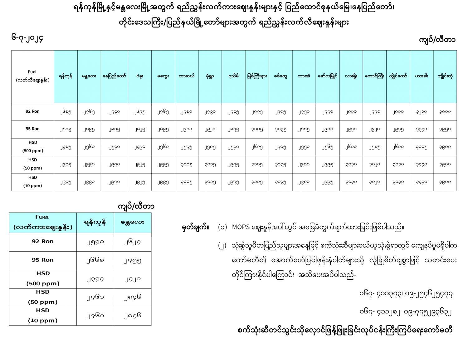 ရန်ကုန်မြို့နှင့် မန္တလေးမြို့အတွက် ရည်ညွှန်းလက်ကားဈေးနှုန်းများနှင့် ပြည်ထောင်စုနယ်မြေ နေပြည်တော်၊ တိုင်းဒေသကြီး/ပြည်နယ် မြို့တော်များအတွက် ရည်ညွှန်းလက်လီဈေးနှုန်းများ 07/06/2024