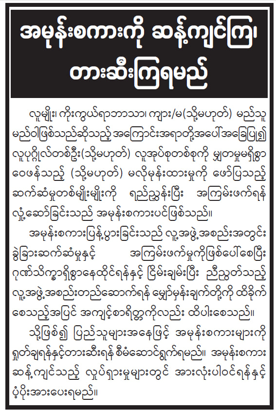 သို့ဖြစ်၍ ပြည်သူများအနေဖြင့် အမုန်းစကားများကိုရှုတ်ချရန်နှင့် တားဆီးရန် စီမံဆောင်ရွက်ရမည်။ အမုန်းစကားဆန့်ကျင်သည့် လှုပ်ရှားမှုများတွင် အားလုံးပါဝင်ရန်နှင့် ပံ့ပိုးအားပေးရမည်။
