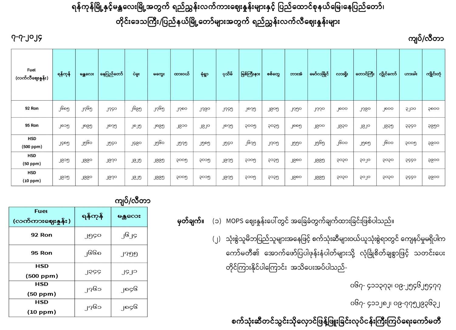 ရန်ကုန်မြို့နှင့် မန္တလေးမြို့အတွက် ရည်ညွှန်းလက်ကားဈေးနှုန်းများနှင့် ပြည်ထောင်စုနယ်မြေ နေပြည်တော်၊ တိုင်းဒေသကြီး/ပြည်နယ် မြို့တော်များအတွက် ရည်ညွှန်းလက်လီဈေးနှုန်းများ 07/07/2024