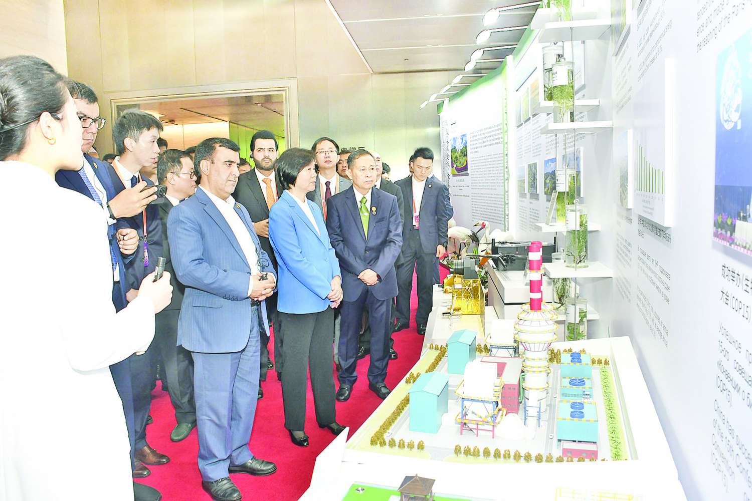 ထို့နောက် နိုင်ငံတော်စီမံအုပ်ချုပ်ရေးကောင်စီ ဒုတိယဥက္ကဋ္ဌ ဒုတိယဝန်ကြီးချုပ် ဦးဆောင်သော မြန်မာကိုယ်စားလှယ်အဖွဲ့သည် စိမ်းလန်းသောဖွံ့ဖြိုးမှုဖိုရမ် အထိမ်းအမှတ်အဖြစ် နိုင်ငံအလိုက် ခင်းကျင်းပြသထားသည့် ရှန်ဟိုင်းပူးပေါင်းဆောင်ရွက်ရေးအဖွဲ့ နိုင်ငံ့ခေါင်းဆောင်များ ပြပွဲအတွင်း လှည့်လည်ကြည့်ရှု လေ့လာကြသည်။