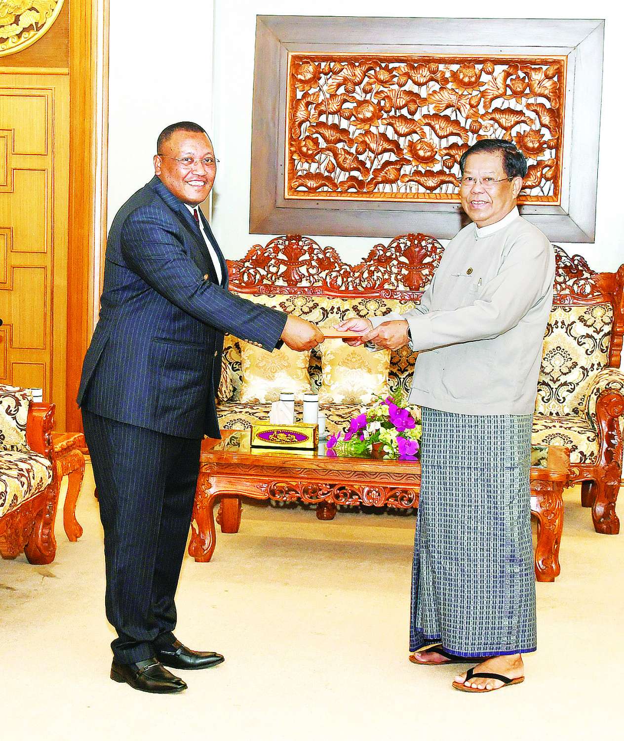 ဒုတိယဝန်ကြီးချုပ်နှင့် နိုင်ငံခြားရေးဝန်ကြီးဌာန ပြည်ထောင်စုဝန်ကြီး ဦးသန်းဆွေသည် တိုကျိုမြို့အခြေစိုက် မြန်မာနိုင်ငံဆိုင်ရာ အီသီယိုပီးယားဖက်ဒရယ်ဒီမိုကရက်တစ်သမ္မတနိုင်ငံ သံအမတ်ကြီးအဖြစ် ပူးတွဲခန့်အပ်ရန် သဘောတူညီပြီးဖြစ်သည့် မစ္စတာ ဒါဘာဒက်ဘ်အီးလ်ဟွန်းဒ်ကို ယနေ့မွန်းလွဲ ၁ နာရီတွင် နေပြည်တော်ရှိ နိုင်ငံခြားရေးဝန်ကြီးဌာန ပြည်ထောင်စုဝန်ကြီး၏ ဧည့်ခန်းမ၌ လက်ခံတွေ့ဆုံသည်။