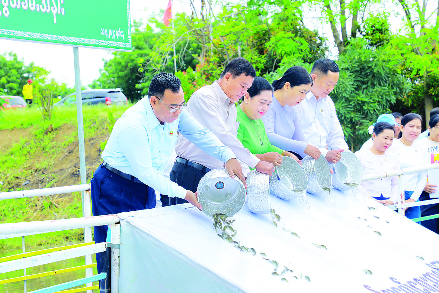 ဦးစွာ ဝဏ္ဏသိဒ္ဓိအားကစားကွင်းရှိ ကန်အမှတ် (၁) ၌ ငါးမြစ်ချင်းသားပေါက်ကောင်ရေ ၇၅၀၀ နှင့် ထိုင်းငါးခုံးမသားပေါက်ကောင်ရေ ၇၅၀၀ စုစုပေါင်း ငါးသားပေါက်ကောင်ရေ ၁၅၀၀၀ စိုက်ထည့်ခြင်းအခမ်းအနားကို ကျင်းပရာ ပြည်ထောင်စုဝန်ကြီး ဦးမင်းသိန်းဇံနှင့် ဇနီး၊ ဒုတိယဝန်ကြီးများနှင့်ဇနီးများ၊ ညွှန်ကြားရေးမှူးချုပ်များနှင့် တာဝန်ရှိသူများက ငါးသားပေါက်များ စိုက်ထည့်ပေးကြသည်။