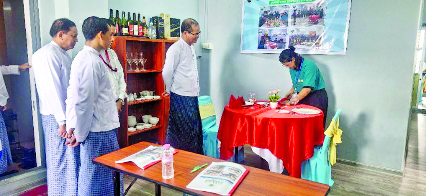 ဦးစွာ သင်တန်းကျောင်းတာဝန်ခံက သင်တန်းကျောင်းကို ၂၀၂၃ ခုနှစ်မှ စတင်တည်ထောင်ဖွင့်လှစ်ခဲ့ပြီး Food & Beverage Service Course နှင့် House- keeping Operation Course သင်တန်းနှစ်မျိုးကို စာတွေ့ ၄၀ ရာခိုင်နှုန်း၊ လက်တွေ့ ၆၀ ရာခိုင်နှုန်းဖြင့် သင်တန်းကာလ တစ်လ၊ Internship နှစ်လဖြင့် ဖွင့်လှစ်ပို့ချလျက်ရှိကြောင်း၊ ၂၀၂၃-၂၀၂၄ ဘဏ္ဍာရေးနှစ်အတွင်း Food & Beverage Service Course နှင့် Housekeeping Operation Course သင်တန်းတို့အတွက် သင်တန်းသား ၁၁၃ ဦးနှင့် Housekeeping Operation Course ကို သင်တန်းသား ၁၁၁ ဦး သင်ကြားပို့ချပေးနိုင်ခဲ့ပြီး ပြည်ပအလုပ်အကိုင်အခွင့်အလမ်းအနေဖြင့် ၃၁ ရာခိုင်နှုန်း ရရှိခဲ့ကြောင်း၊ ၂၀၂၄-၂၀၂၅ ဘဏ္ဍာရေးနှစ်အတွင်း သင်တန်းသား ၁၃၀ ကျော် သင်ကြားပို့ချနိုင်ရေး ဆောင်ရွက်သွားမည်ဖြစ်ကြောင်း၊ သင်ကြားနေသည့် သင်ရိုးညွှန်းတမ်းများသည် ဟိုတယ်လုပ်ငန်းခွင်တွင် မဖြစ်မနေအသုံးချနေသည့် သင်ရိုးညွှန်းတမ်းများဖြစ်သည့်အတွက် ပြည်တွင်း၊ ပြည်ပအလုပ်အကိုင်အခွင့်အလမ်းများ ပိုမိုဖန်တီးပေးနိုင်ကြောင်း၊ ဟိုတယ်နှင့် ခရီးသွားလုပ်ငန်းနယ်ပယ်ဝန်ဆောင်မှုအဆင့်အတန်း ပိုမိုကောင်းမွန်စေရေးနှင့် နိုင်ငံ၏လူ့စွမ်းအားအရင်းအမြစ် ဖွံ့ဖြိုးတိုးတက်စေရေးအတွက် တစ်ထောင့်တစ်နေရာမှ အထောက်အကူဖြစ်စေရေး ရည်ရွယ်၍ လုပ်ကိုင်ဆောင်ရွက်လျက်ရှိကြောင်း ရှင်းလင်း တင်ပြသည်။