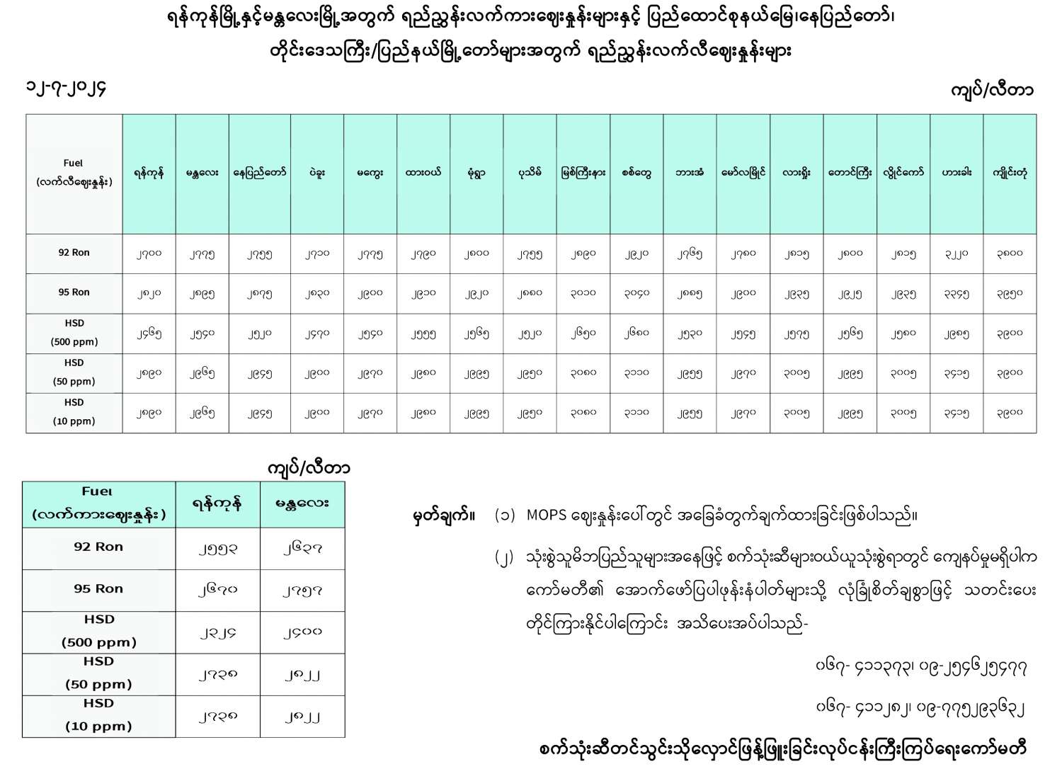 ရန်ကုန်မြို့နှင့် မန္တလေးမြို့အတွက် ရည်ညွှန်းလက်ကားဈေးနှုန်းများနှင့် ပြည်ထောင်စုနယ်မြေ နေပြည်တော်၊ တိုင်းဒေသကြီး/ ပြည်နယ် မြို့တော်များအတွက် ရည်ညွှန်းလက်လီဈေးနှုန်းများ 07/12/2024