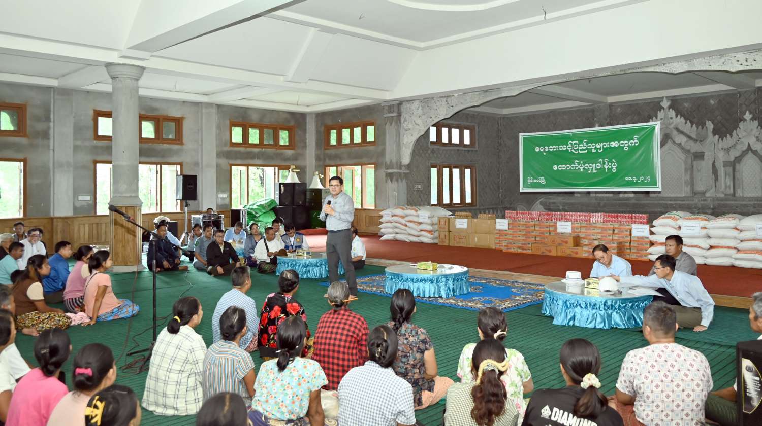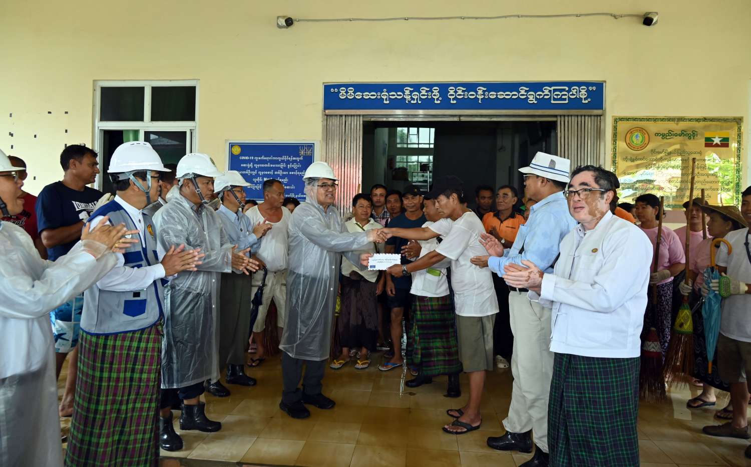 ယင်းနောက် ဝိုင်းမော်မြို့အမှတ်(၃)ရပ်ကွက်အတွင်းရှိ အောင်ချမ်းသာဘုန်းတော်ကြီးကျောင်း၌ ဝိုင်းမော်မြို့နယ်အတွင်းရှိ ရေဘေးသင့်ပြည်သူများအား ထောက်ပံ့ပေးအပ်ပွဲ အခမ်းအနားသို့ တက်ရောက်ပြီး ပြည်နယ်ဝန်ကြီးချုပ်က ဧရာဝတီမြစ်ရေကြီးမြင့်မှုသည် နှစ်ပေါင်း ၂၀ ကျော် ကြာမှ ပြန်လည်ဖြစ်ပေါ်ခဲ့ပြီး ယခုရေကြီးမှုဖြစ်စဉ်တွင် မိမိတို့အားလုံး၏စည်းလုံးမှုအင်အားကို မြင်တွေ့ခဲ့ရပြီး ထိခိုက်မှုအနည်းဆုံးဖြစ်အောင် လျင်မြန်စွာတုံ့ပြန်ဆောင်ရွက်နိုင်ခဲ့ပါကြောင်း၊ ရေဘေးသင့် ပြည်သူများအတွက်လည်း အမျိုးသားသဘာဝဘေးအန္တရာယ်စီမံခန့်ခွဲမှုကော်မတီက ကယ်ဆယ်ရေးပစ္စည်းများနှင့် စားသောက်ကုန်များကို အလျင်မြန်ဆုံး ပို့ဆောင်ပေးနိုင်ခဲ့ပါကြောင်း၊ မိသားစုများအနေဖြင့် လိုအပ်သည်များကို ပွင့်လင်းရင်းနှီးစွာ တင်ပြစေလိုကြောင်း အားပေးပြော ကြားသည်။