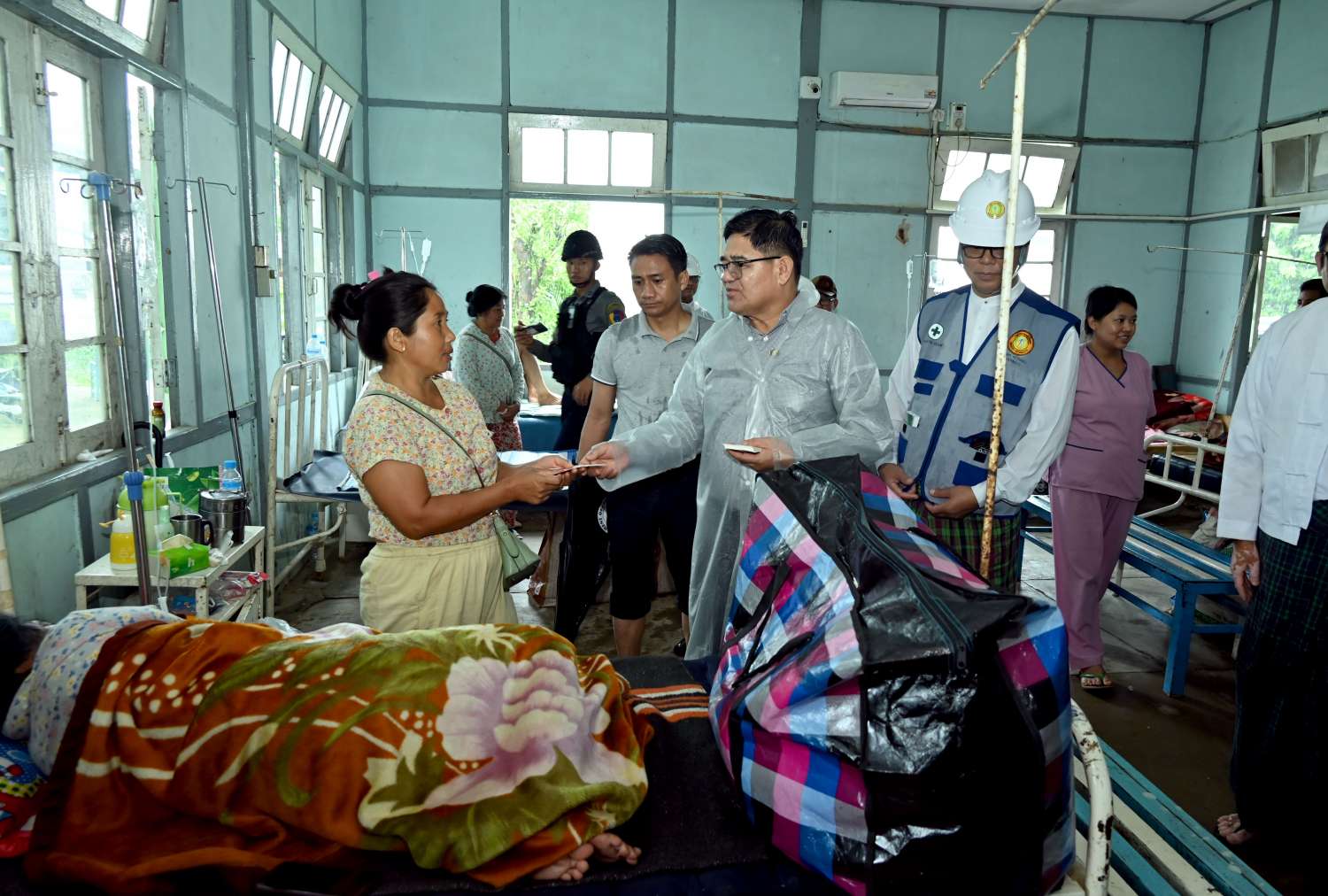 ထို့နောက်ပြည်နယ်ဝန်ကြီးချုပ်နှင့်အဖွဲ့ဝင်များသည် ဝိုင်းမော်မြို့နယ် ပြည်သူ့ဆေးရုံသို့ သွားရောက်ပြီး ရေကြီးရေလျှံမှုကြောင့် ရေနစ်မြှုပ်ခဲ့သည့် ဆေးရုံ (၂)ထပ်လူနာဆောင်သစ်အား ဌာန ဆိုင်ရာများ၊ ကျန်းမာရေး ဝန်ထမ်းများ၊ မီးသတ်တပ်ဖွဲ့ဝင်များနှင့် လူမှုကူညီရေးအသင်းအဖွဲ့များက စုပေါင်းသန့်ရှင်းရေးလုပ်ငန်းများဆောင်ရွက်နေမှုများကို လိုက်လံကြည့်ရှုအားပေးခဲ့ကြပြီး ပြည်နယ်ဝန်ကြီးချုပ်က သန့်ရှင်းရေးဆောင်ရွက်ကြသည့် ဌာန/အဖွဲ့အစည်းများအတွက် ထောက်ပံ့ငွေများကို ထောက်ပံ့ပေးအပ်ကာ ဆေးရုံအတွင်း တက်ရောက်ဆေးဝါးကုသမှုခံယူနေသော လူနာများအား ရင်းရင်းနှီးနှီး လိုက်လံနှုတ်ဆက်အားပေးကာ ထောက်ပံ့ငွေများကို ထောက်ပံ့ပေးအပ်ခဲ့သည်။