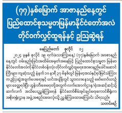 (၇၇) နှစ်မြောက် အာဇာနည်နေ့တွင် ပြည်ထောင်စုသမ္မတမြန်မာနိုင်ငံတော်အလံ တိုင်ဝက်လွှင့်ထူရန်နှင့် ဥဩဆွဲရန် 07/13/2024