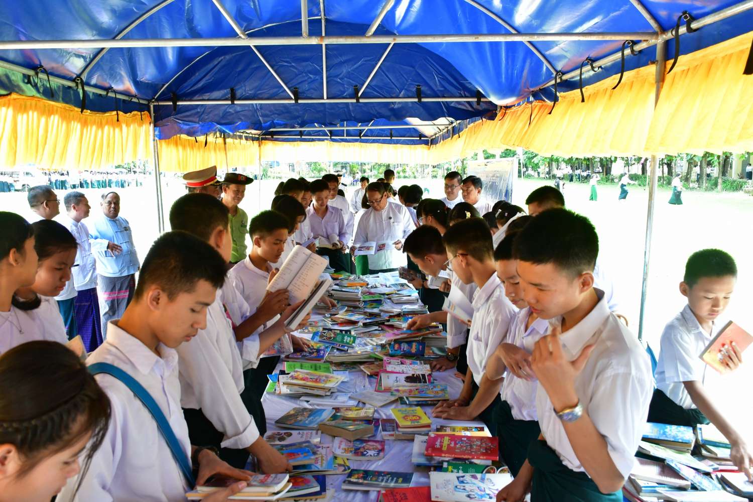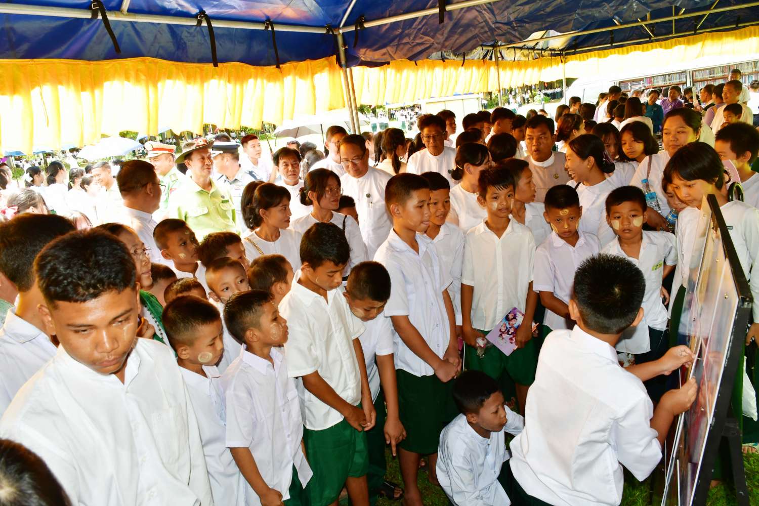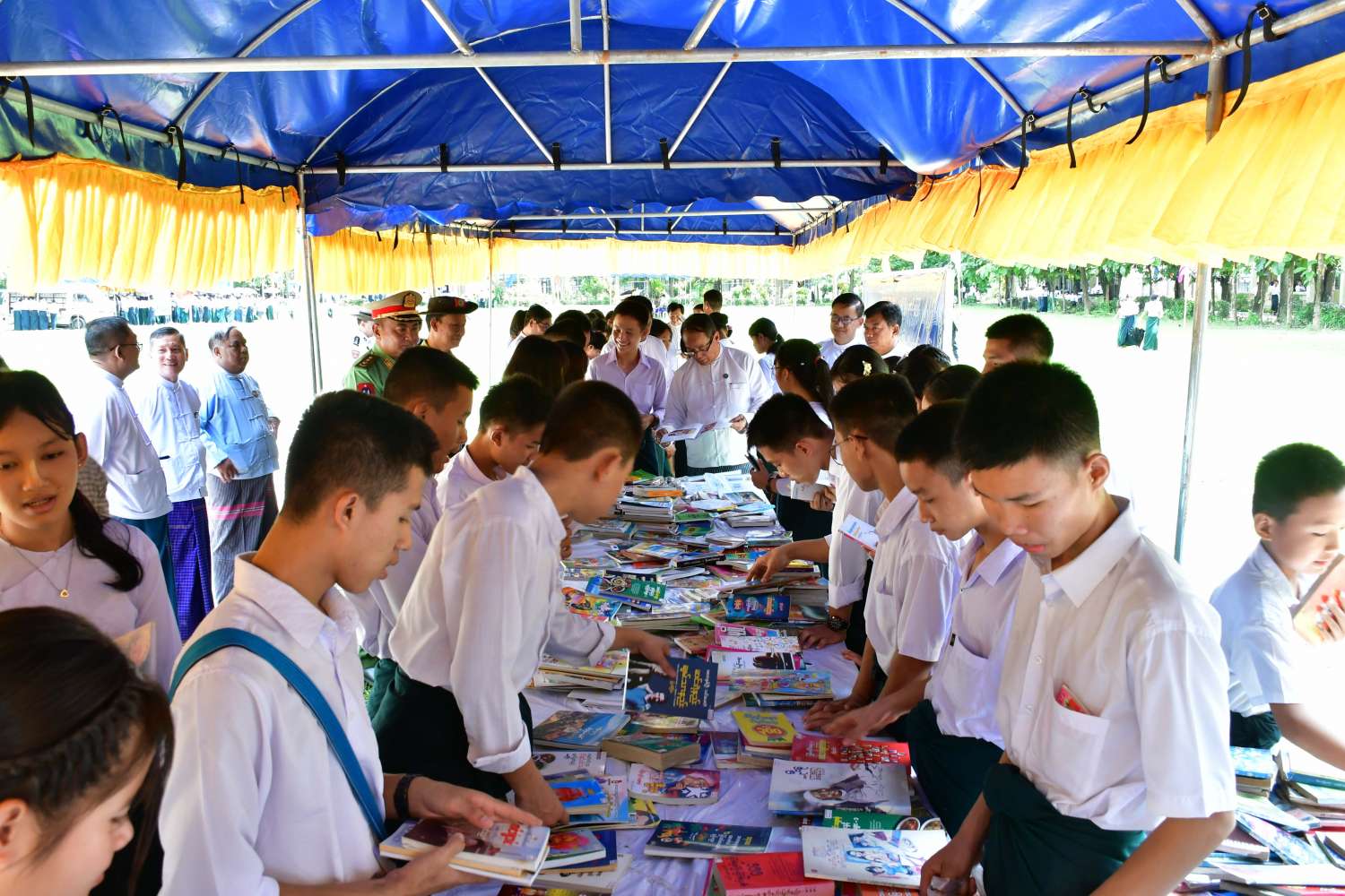 ဆက်လက်၍ ပြည်နယ်ဝန်ကြီးချုပ်နှင့်အဖွဲ့သည် ကျောင်းစာကြည့်တိုက်များ ဖွံ့ဖြိုးတိုးတက်ရေးနှင့် စာဖတ်ရှိန်မြှင့်တင်ရေးပွဲတော်အတွင်း ပြန်ကြားရေးနှင့်ပြည်သူ့ဆက်ဆံရေးဦးစီးဌာနနှင့် အခြေခံပညာဦးစီးဌာနတို့ ပူးပေါင်း၍ ခင်းကျင်းပြသထားသော ရွှေ့လျားစာကြည့်တိုက်မော်တော်ယာဉ်၊ ကရင်တိုင်းရင်းသားစာပေဉာဏ်စမ်းပဟေဋ္ဌိပြိုင်ပွဲ၊ စကားပုံဆက်ပြိုင်ပွဲ၊ ရုပ်ပုံဆက်ပြိုင်ပွဲ၊ ဘားအံတက္ကသိုလ်၊ နည်းပညာတက္ကသိုလ်၊ ကွန်ပျူတာတက္ကသိုလ်တို့မှ စာဖတ်ရှိန်မြှင့်တင်ရေး အထောက်အကူပြုပြခန်းများ၊ လှပသာယာပြည်မြန်မာဓာတ်ပုံပြပွဲများ၊ ဉာဏ်စမ်းပဟေဋ္ဌိပြိုင်ပွဲ (Kahoot Quiz)၊ အလယ်တန်းအဆင့် စာစီစာကုံးပြိုင်ပွဲ၊ ပုဂ္ဂလိကစာအုပ်အရောင်းဆိုင်များနှင့် ချိတ်ဆက်၍ စာအုပ်ဈေးရောင်းပွဲများ၊ အထက်တန်းအဆင့်ကျပန်းစကားပြောပြိုင်ပွဲ၊ အလယ်တန်းအဆင့် ပုံပြင်ပြောပြိုင်ပွဲ၊ မူလတန်းအဆင့် ကဗျာရွတ်ပြိုင်ပွဲ၊ လူငယ်စာဖတ်ဝိုင်းနှင့် စာပေဟောပြောပွဲများတွင် ကျောင်းသား၊ကျောင်းသူများ ပျော်ရွှင်စွာ စာအုပ် စာပေလေ့လာဖတ်ရှုနေမှု၊ ပြိုင်ပွဲများတွင် ပါဝင်ယှဉ်ပြိုင်နေမှုတို့ကို လှည့်လည်ကြည့်ရှုအားပေးခဲ့ကြပြီး သုတ၊ ရသ စာအုပ်ပေါင်း ၃၀၀၀ ခန့်ရှိ အမှတ်(၂) အခြေခံပညာအထက်တန်းကျောင်းစာကြည့်တိုက်တွင် ကျောင်းသားလူငယ်များ စာပေဖတ်ရှုလေ့လာနေမှုတို့ကို ကြည့်ရှုအားပေးကာ ကျောင်းစာကြည့်တိုက်အတွက် ငွေကျပ်(၁၀)သိန်းကို ထောက်ပံ့ပေးအပ်သည်။