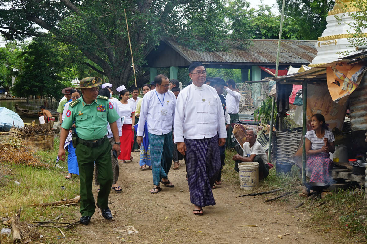 ထို့နောက် တိုင်းဒေသကြီးဝန်ကြီးချုပ်နှင့် တာဝန်ရှိသူများက ရေးဘေးသင့်ပြည်သူများအား မြို့နယ်ပြည်သူ့ကျန်းမာရေးဦးစီးဌာနနှင့် တိုင်းရင်းဆေးပညာဦးစီးဌာနတို့မှ ယာယီဆေးခန်းများဖွင့်လှစ်၍ လိုအပ်သော ကျန်းမာရေးစောင့်ရှောက်မှုများ ဆောင်ရွက်ပေးနေမှုနှင့် ယာယီရေဘေးရှောင်စခန်းများ ဖွင့်လှစ်ထားရှိမှုနှင့် မြို့ပေါ်ရပ်ကွက်များအတွင်း ဧရာဝတီမြစ်ရေဝင်ရောက်မှုအခြေအနေများကို လှည့်လည်ကြည့်ရှုစစ်ဆေးခဲ့ကြသည်။