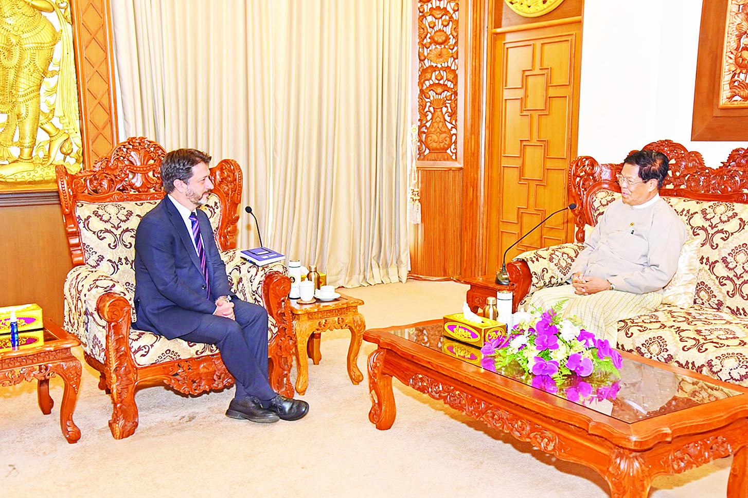ဒုတိယဝန်ကြီးချုပ်နှင့် နိုင်ငံခြားရေးဝန်ကြီးဌာန ပြည်ထောင်စုဝန်ကြီး ဦးသန်းဆွေသည် တာဝန်ပြီးဆုံး၍ မြန်မာနိုင်ငံမှ ပြန်လည်ထွက်ခွာတော့မည့် အပြည်ပြည်ဆိုင်ရာ ရွှေ့ပြောင်းသွားလာရေးအဖွဲ့ (International Organization for Migration-IOM) ၏ မြန်မာနိုင်ငံဆိုင်ရာအကြီးအကဲ Mr. Dragan Aleksoski ကို ယနေ့မွန်းလွဲပိုင်းတွင် နေပြည်တော်ရှိ နိုင်ငံခြားရေးဝန်ကြီးဌာန၌ လက်ခံတွေ့ဆုံသည်။
