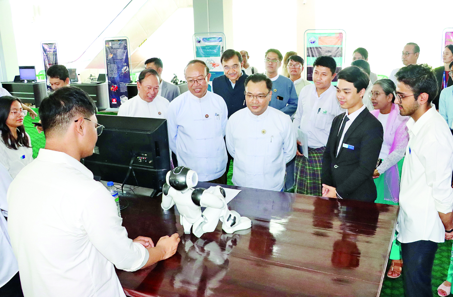 ထို့နောက် ဒုတိယဝန်ကြီးသည် တက်ရောက်လာကြသူများနှင့်အတူ စက်ရုပ်၊ ဉာဏ်ရည်တု နည်းပညာများ အပါအဝင် ခေတ်မီ IT Hardware နှင့် Software နည်းပညာများကို ကျောင်းသား ကျောင်းသူများက အဖွဲ့လိုက်ပေါင်းစပ်အသုံးချပြီး တီထွင်ဆန်းသစ်ထားသည့် သုတေသနပရောဂျက် ၃၄ ခုကို လှည့်လည်ကြည့်ရှုအားပေးကာ သုတေသနရလဒ်များကို ပြည်သူများ၏ လူမှုစီးပွားဘဝဖွံ့ဖြိုးတိုးတက်စေရေး အမှန်တကယ် အကျိုးပြုနိုင်ရန်အတွက် ပရောဂျက်မှ လက်တွေ့နယ်ပယ်များ၌ အသုံးချနိုင်ရေး ဆက်လက်ဆောင်ရွက်ရန် မှာကြားသည်။