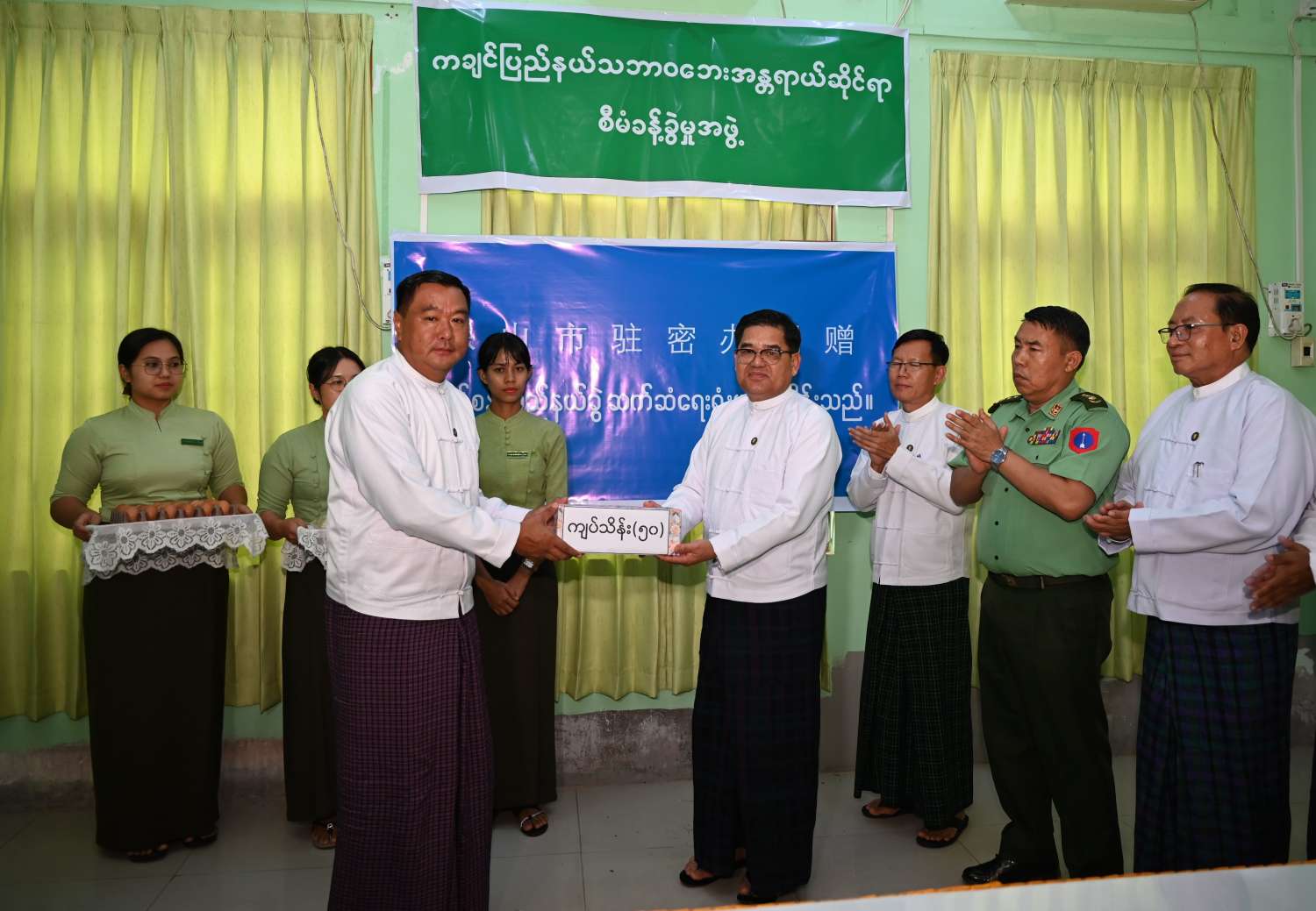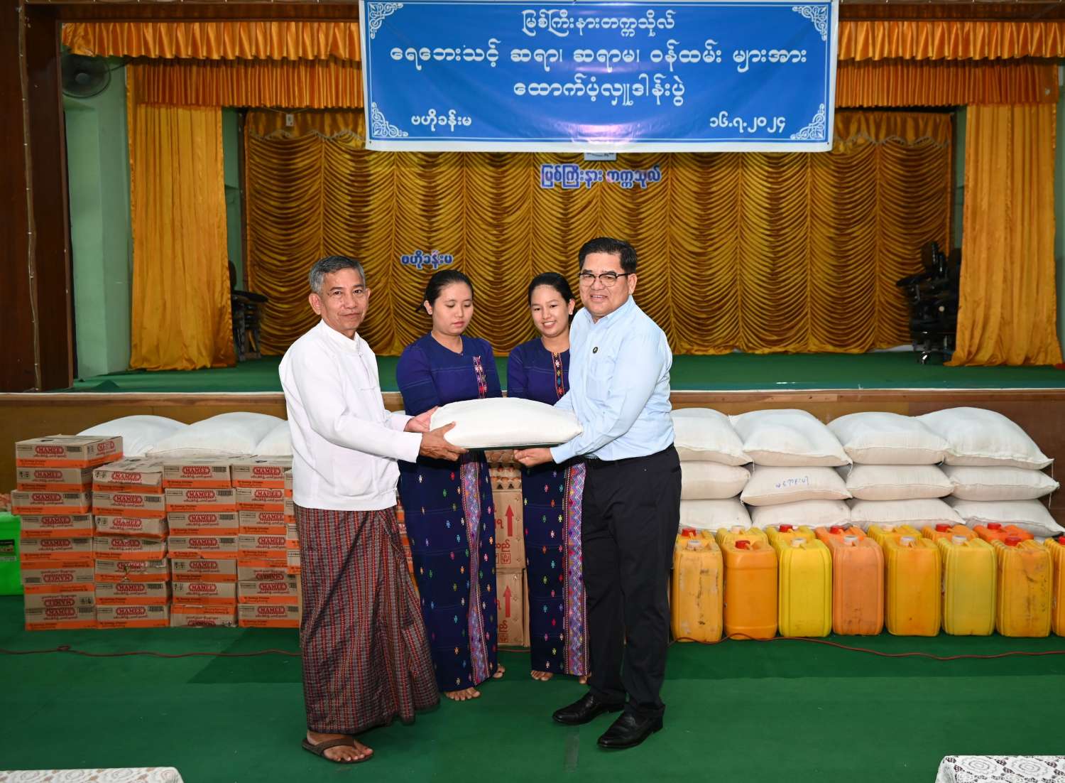 အခမ်းအနားတွင် ပြည်နယ်ဝန်ကြီးချုပ်က ကျေးဇူးတင်ဂုဏ်ပြုစကားပြောကြားပြီး အလှူရှင်တရုတ်ပြည်သူ့သမ္မတနိုင်ငံ၊ ယူနန်ပြည်နယ်၊ ပေါင်စန်းပြည်နယ်ခွဲ မြစ်ကြီးနားအခြေစိုက်ဆက်ဆံရေး ရုံး (ထိန်မိန် ကုမ္ပဏီဆက်ဆံရေးရုံးနှင့် ပြည်နယ်တိုင်းရင်းသားရေးရာဝန်ကြီးဌာနတို့က အလှူငွေကျပ် သိန်း ၅၀ ၊ ဆန်အိတ် (၁၅၀)၊ ကြက်ဥ ၁၀၈၀၀ လုံး၊ ပိုးသတ်ဆေးရည် (၄၀၀)ပုလင်း၊ အကိုက်အခဲပျောက်ဆေးနှင့် အဖျားကျဆေး (၃၆၀) ဗူး ပေးအပ်လှူဒါန်းမှုကို လက်ခံရယူပြီး ကျေးဇူးတင်ဂုဏ်ပြု မှတ်တမ်းလွှာကို ပြန်လည်ပေးအပ်ခဲ့ကြောင်းသိရသည်။