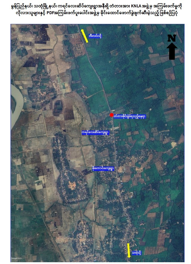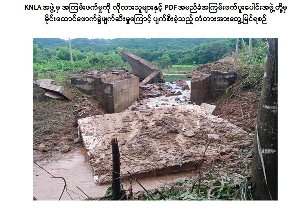 ယခုတွင်လည်း KNLAအဖွဲ့မှ အကြမ်းဖက်မှုလိုလားသူများနှင့် PDF အမည်ခံ အကြမ်းဖက်သမားများသည် ယနေ့နံနက်ပိုင်းတွင် ခရီးသွားပြည်သူများနှင့် ဒေသခံ ပြည်သူများ အားထားအသုံးပြုလျက်ရှိသည့် မွန်ပြည်နယ်၊ သထုံမြို့နယ်၊ ကရင်လေးဆိပ်ကျေးရွာမြောက်ဘက် မီတာ ၁၀၀ ခန့်အကွာရှိ ရန်ကုန်-မော်လမြိုင် ပြည်ထောင်စုကားလမ်းမကြီးပေါ် မိုင်တိုင်အမှတ်၊ ၁၃၆/၂ နှင့် ၁၃၆/၃ ကြားတွင်ရှိသည့် အရှည် (၁၀) ပေ၊ အကျယ် (၄၀) ပေ ၊ ခံနိုင်ဝန် (၆၀) တန်ရှိ သံကူကွန်ကရစ်အမျိုးအစားတံတားအမှတ် (၁/၁၃၇) ကို မိုင်းထောင်ဖောက်ခွဲဖျက်ဆီးခဲ့သဖြင့် တံတား၏ မြောက်ဘက်ကမ်းကပ်ခုံမှာ ၁၀၀ ရာခိုင်နှုန်း ပြိုကျပျက်စီးခဲ့သည်။