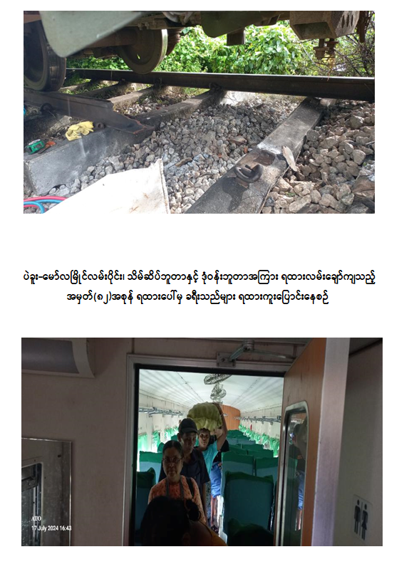 ယနေ့ မော်လမြိုင်မှ ထွက်ခွာလာသည့် အမှတ် (၈၂) အစုန် မော်လမြိုင်-ရန်ကုန်လူစီးအမြန်ရထားသည် မွန်ပြည်နယ်၊ သထုံမြို့နယ်၊ သိမ်ဆိပ်ဘူတာနှင့် ဒုံဝန်းဘူတာအကြား မိုင်တိုင်အမှတ်၊ ၁၂၃/၁၇-၁၅ သို့ နံနက် ၁၁ နာရီ ၁၀ မိနစ်အချိန် ရထားရောက်ရှိဖြတ်သန်းစဉ် အဆိုပါနေရာ၌ ရထားလမ်းမိုင်းပေါက်ကွဲထားခြင်းကြောင့် သံလမ်း (၁) ပေခွဲခန့် ပြတ်တောက်နေသဖြင့် စက်ခေါင်းနှင့်အတူ ရထားတွဲဆိုင်းတွင်ပါရှိသော လူစီးတွဲ (၂) တွဲ လမ်းချော်ကျမှုဖြစ်ပွားသည်။ ရထားလမ်းချော်ကျမှုကြောင့် ခရီးသည်နှင့် ဝန်ထမ်းထိခိုက်မှုမရှိဘဲ သိမ်ဆိပ်-ဒုံဝန်းလမ်းပိုင်းအား နံနက် ၁၁ နာရီ ၁၃ မိနစ်တွင် ယာယီပိတ်ထားခဲ့ရပါသည်။