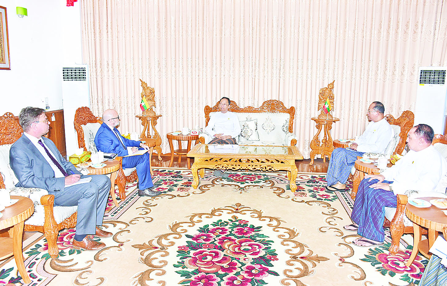ကျန်းမာရေးဝန်ကြီးဌာန ပြည်ထောင်စုဝန်ကြီး ဒေါက်တာသက်ခိုင်ဝင်းသည် ကုလသမဂ္ဂလူဦးရေရန်ပုံငွေအဖွဲ့ (UNFPA) ရုံးမှ မြန်မာနိုင်ငံဆိုင်ရာ ဌာနေကိုယ်စားလှယ် Mr. Jaime Nadal Roig ဦးဆောင်သည့် ကိုယ်စားလှယ်အဖွဲ့ကို ယမန်နေ့မွန်းလွဲပိုင်းတွင် ကျန်းမာရေးဝန်ကြီးဌာန၏ ဧည့်ခန်းမ၌ လက်ခံတွေ့ဆုံဆွေးနွေးသည်။