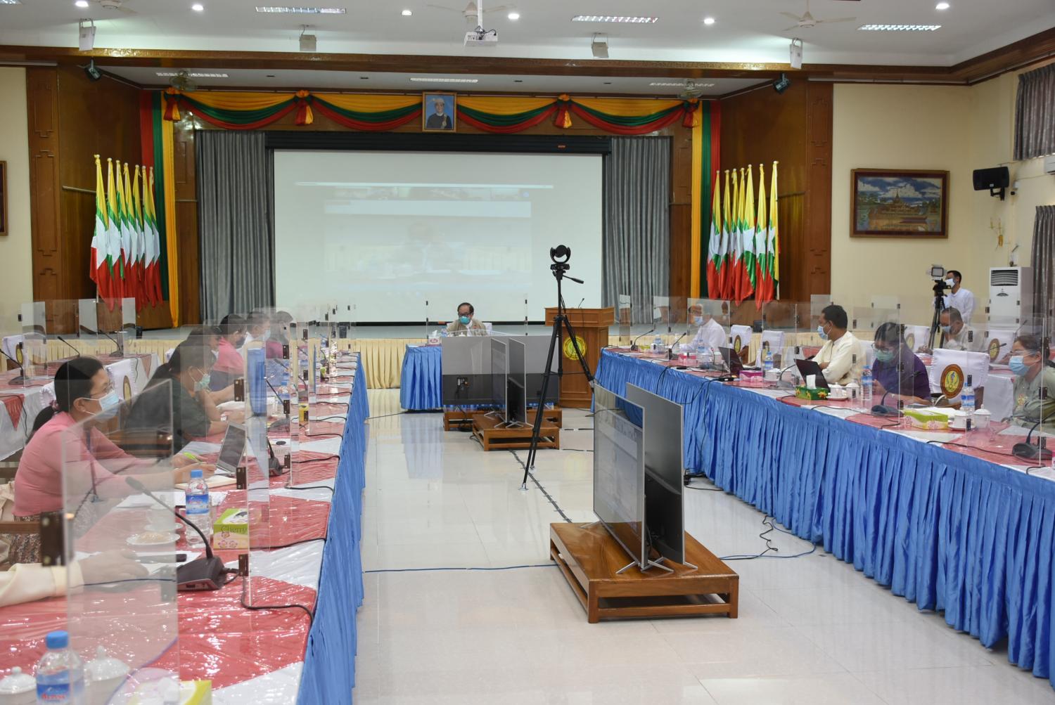 အစည်းအဝေးတွင် ကိုဗစ်-19 ကုသရေးဌာန (ဖောင်ကြီး) တွင် လူနာဆောင်များ ထပ်မံ တိုးချဲ့နေမှု၊ ကျန်းမာရေး စောင့်ရှောက်မှုပေးသူများအတွက် သီးသန့်နေထိုင်ရန် အဆောက် အဦနှင့် အဆောင်များရရှိရေး စီမံဆောင်ရွက်နေမှုတို့အား တင်ပြခြင်း၊ လူနာများအား ကိုင်တွယ် ကုသမှုပေးနေသည့် ကျန်းမာရေးစောင့်ရှောက်သူများသည် ရောဂါကူးစက်ခံ ရနိုင်ချေမြင့်မား သူများဖြစ်သဖြင့် နေအိမ်သို့ ပြန်လည်နေထိုင်ပါက နေအိမ်ရှိအတူနေမိသားစုဝင်များထံ ရောဂါကူးစက်နိုင်ချေရှိမှုနှင့် ကျန်းမာရေးစောင့်ရှောက်မှုပေးသူများအတွက် သီးသန့်နေထိုင်ရန် အဆောင် နေရာများ၊ စားသောက်ရန်နှင့် ပို့ဆောင်ရန် အစီအစဉ်များ တင်ပြခြင်း၊ အားကစားနှင့် ကာယပညာသိပ္ပံ (ရန်ကုန်) ရှိ အဆောင်များတွင် လူနာများအား ကိုင်တွယ်ကုသမှု ပေးနေသည့် ကျန်းမာရေးစောင့်ရှောက်မှုပေးသူများ နေထိုင်ရေး၊ စားသောက်ရေးနှင့် ပို့ဆောင်ရေးတို့ အတွက် စီစဉ်ထားရှိမှု အခြေအနေများ တင်ပြခြင်း။