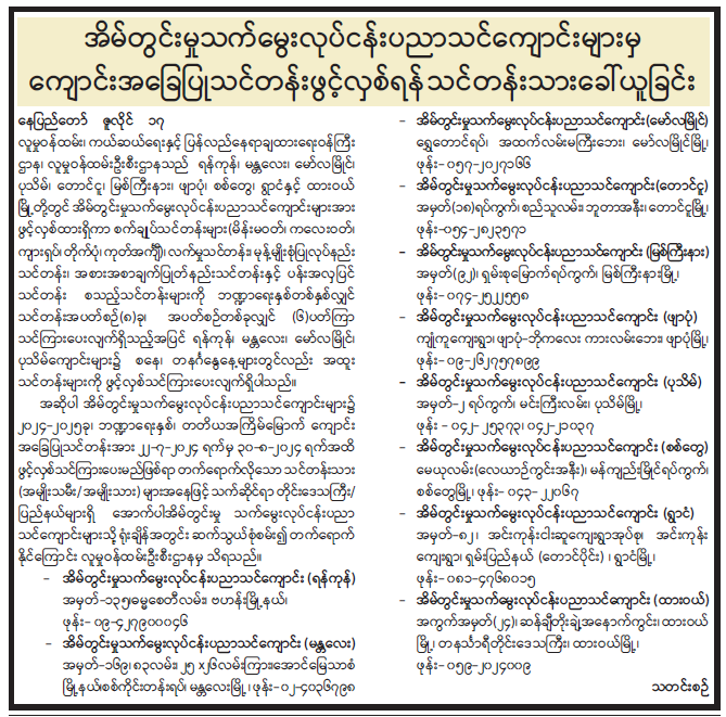 အိမ်တွင်းမှုသက်မွေးလုပ်ငန်းပညာသင်ကျောင်းများမှ ကျောင်းအခြေပြုသင်တန်းဖွင့်လှစ် ရန် သင်တန်းသားခေါ်ယူခြင်း 07/18/2024