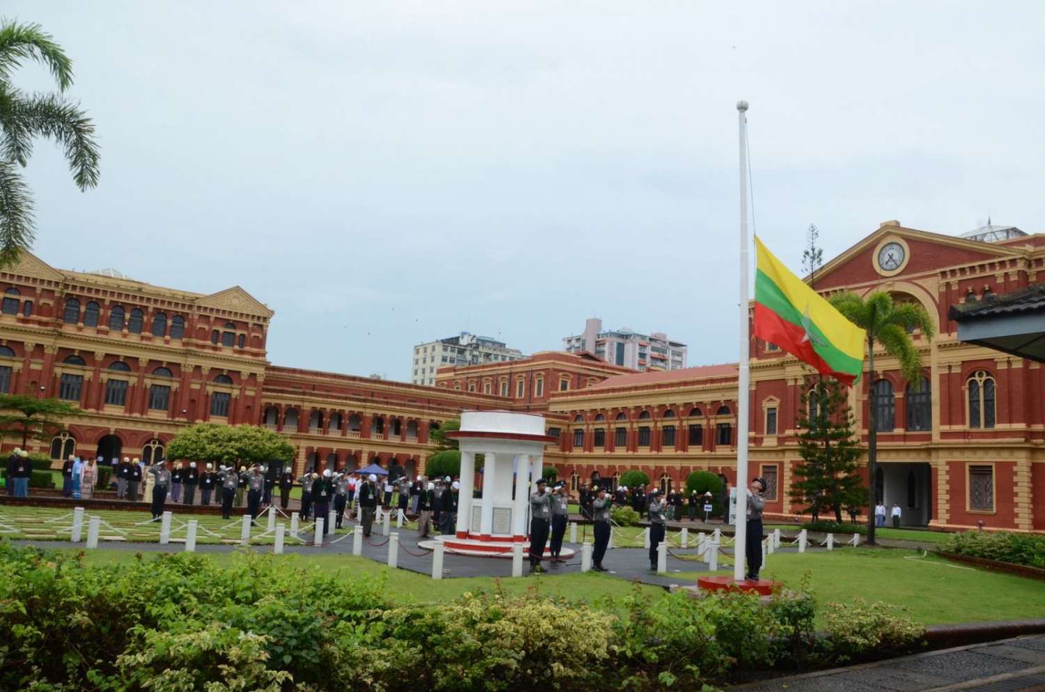 (၇၇)နှစ်မြောက် အာဇာနည်နေ့တွင် ဝမ်းနည်းခြင်းအထိမ်းအမှတ် နိုင်ငံတော်အလံအား တိုင်ဝက်လျှော့ချလွှင့်ထူ၍ အလေးပြုခြင်းအခမ်းအနားကို ယနေ့နံနက် ၇ နာရီခွဲက ဗိုလ်ချုပ်အောင်ဆန်းနှင့်တကွ အာဇာနည်ခေါင်ဆောင်ကြီးများကျဆုံးခဲ့ရာ ရန်ကုန်မြို့ ဗိုလ်တထောင်မြို့နယ် သိမ်ဖြူလမ်းရှိ ဝန်ကြီးများရုံး(ယခင်အတွင်းဝန်ရုံး)၌ ကျင်းပသည်။