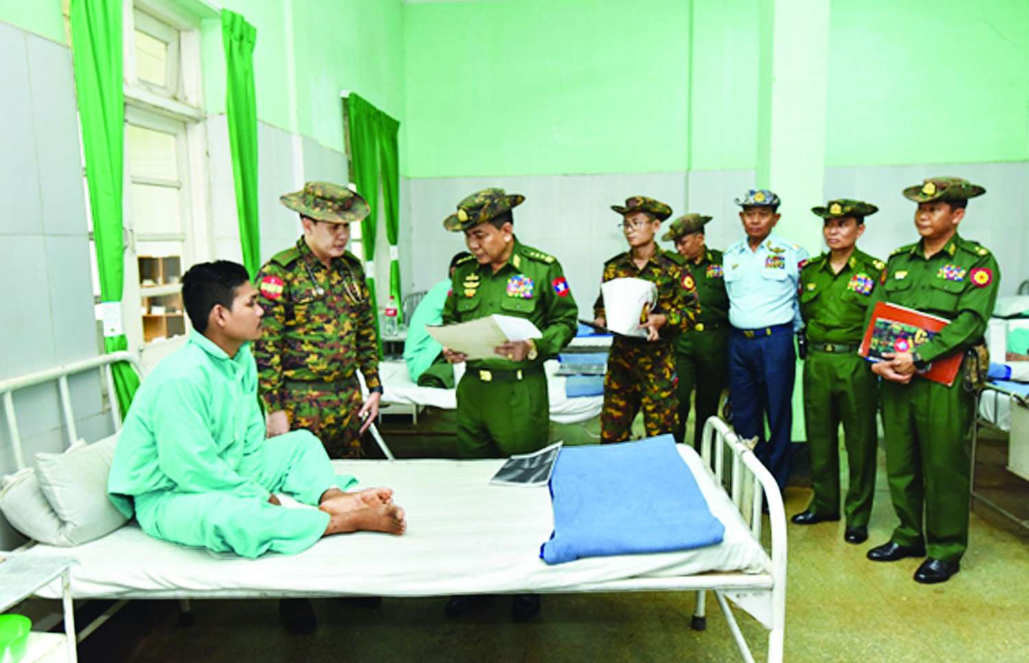 ထို့နောက် ညှိနှိုင်းကွပ်ကဲရေးမှူး (ကြည်း၊ ရေ၊ လေ) နှင့် အဖွဲ့ဝင်များသည် နယ်မြေခံတပ်မတော် ဆေးရုံ၌ တက်ရောက်ဆေးကုသမှုခံယူလျက်ရှိသည့် အရာရှိ၊ စစ်သည်များအား တစ်ဦးချင်း လိုက်လံကြည့်ရှု၍ ရောဂါဖြစ်ပွားမှုအခြေအနေများ၊ ဆေးဝါးကုသမှုပေးထားမှုအခြေအနေများ၊ ရောဂါကုသပျောက်ကင်းသက်သာမှု အခြေအနေများနှင့် ကျန်းမာရေးတိုးတက်ကောင်းမွန်မှုအခြေအနေများကို ရင်းရင်းနှီးနှီး မေးမြန်းအားပေးစကားပြောကြားပြီး စားသောက်ဖွယ်ရာများနှင့် ဂုဏ်ပြုချီးမြှင့်ငွေများ ပေးအပ်သည်။