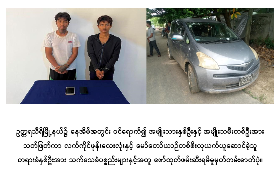 နေပြည်တော်ကောင်စီနယ်မြေ၊ ဥတ္တရသီရိမြို့နယ်၌ နေအိမ်အတွင်းဝင်ရောက်၍ အမျိုးသားနှစ်ဦးနှင့် အမျိုးသမီးတစ်ဦးအားသတ်ဖြတ်ကာ လက်ကိုင်ဖုန်းလေးလုံးနှင့် မော်တော်ယာဉ်တစ်စီး လုယက်ယူဆောင်ခဲ့သူ တရားခံနှစ်ဦးအား ဖော်ထုတ်ဖမ်းဆီးရမိ