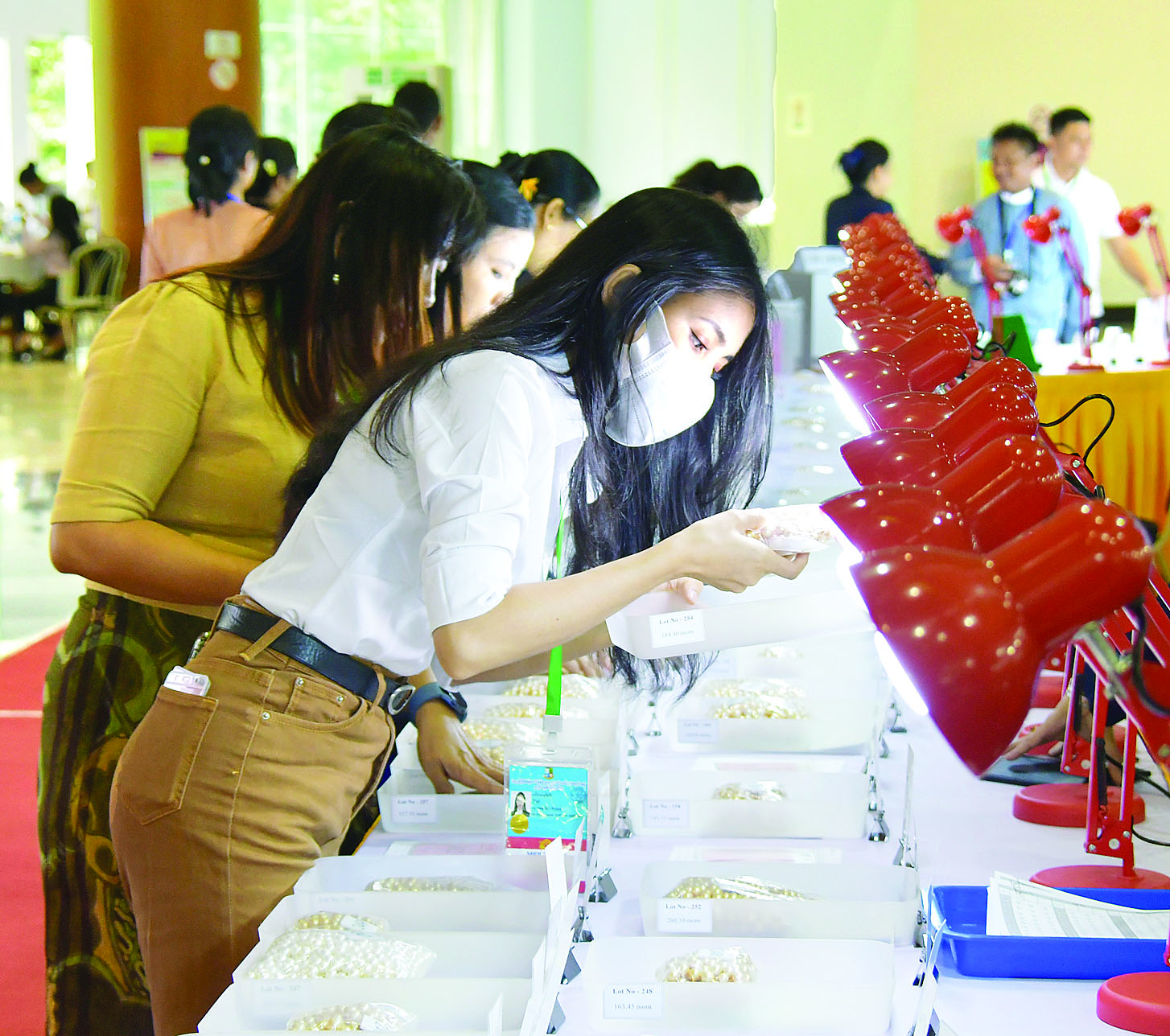 ယနေ့နံနက်ပိုင်းမှစ၍ ပြည်တွင်း၊ ပြည်ပရတနာကုန်သည်များသည် မဏိရတနာကျောက်စိမ်းခန်းမအတွင်း၌ ရောင်းချရန် ခင်းကျင်းပြသထားသည့် ပုလဲအတွဲများကို စိတ်ကြိုက်လေ့လာကြည့်ရှုကြသည်။