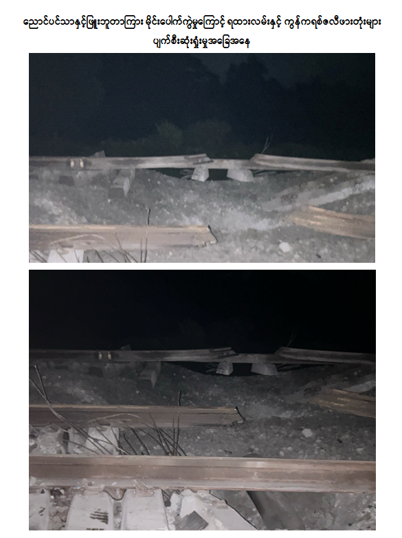 အကြမ်းဖက်သောင်းကျန်းသူအဖွဲ့များအနေဖြင့် ၂၀၂၁ ခုနှစ်၊ ဖေဖော်ဝါရီလမှစ၍ ယခုအချိန်အထိ မြန်မာ့မီးရထားလမ်းကွန်ရက်တစ်ခုလုံးတွင် ရထားလမ်းနှင့် ရထားဘူတာနယ်မြေအတွင်း ဗုံးထောင်မိုင်းခွဲ/ ဖျက်ဆီးခြင်း(၇၉)ကြိမ်၊ ရထားတံတား/ သံလမ်းများအား မိုင်းခွဲဖျက်ဆီးခြင်း (၁၇၁)ကြိမ်၊ ဘူတာအဆောက်အဦနှင့် ဝန်ထမ်းနေအိမ်များအား မီးရှို့ဖျက်ဆီးခြင်း (၁၆)ကြိမ် ကျူးလွန်ခဲ့ကြသည်။