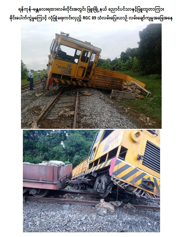ရန်ကုန်-မန္တလေးရထားလမ်းပိုင်းအတွင်း ဖြူးမြို့နယ် ညောင်ပင်သာနှင့် ဖြူးဘူတာကြား မိုင်းပေါက်ကွဲမှုကြောင့် လုံခြုံရေးကင်းလှည့်သံလမ်းပြေးယာဉ် (RGC- 89) လမ်းချော်ကျမှုဖြစ်ပွားပြီး လူစီးရထားနှင့်ကုန်ရထားများ ကြန့်ကြာမှုဖြစ်