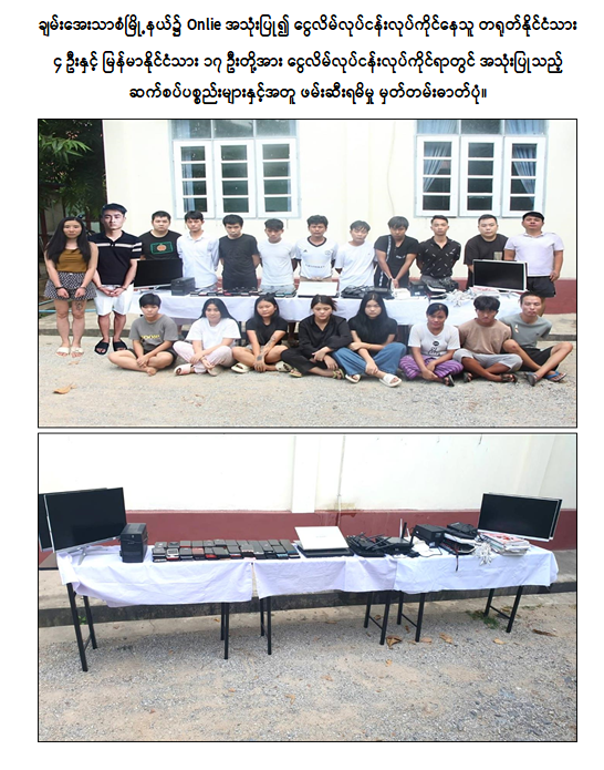 ထိုသို့ရှာဖွေစစ်ဆေးခဲ့ရာ အဆိုပါနေအိမ်အတွင်း၌ Online အသုံးပြု၍ ငွေလိမ်လုပ်ငန်းလုပ်ကိုင်နေသူ Yanlong (၂၈) နှစ်ပါ တရုတ်နိုင်ငံသား အမျိုးသား ၃ ဦးနှင့် အမျိုးသမီး ၁ ဦး၊ မြန်မာနိုင်ငံသား ရှမ်းပြည်နယ် (မြောက်ပိုင်း)၊ လောက်ကိုင်မြို့နယ်၊ ထွမ်ဆန်းရွာနေ ရဲမြင့် (၂၀) နှစ် (ဘ) ဦးယောက်စွတ်ပါ အမျိုးသား ၁၀ ဦးနှင့် အမျိုးသမီး ၆ ဦး၊ နေအိမ်ပိုင်ရှင်ဖြစ်သူ ဒေါ်စန္ဒာတို့အား Online အသုံးပြု၍ ငွေလိမ်လုပ်ငန်းပြုလုပ်ရာတွင် အသုံးပြုသည့် ကွန်ပျူတာ ၄ စုံ၊ Laptop ၂ လုံး၊ 5BB Broad Band တံဆိပ်ပါ Wifi စက် ၁ လုံး၊ Ruijie Regee တံဆိပ်ပါ Wifi ထပ်ဆင့်လွှင့်စက် ၃ လုံး၊ အခြားဆက်စပ်ပစ္စည်းများနှင့်အတူ တွေ့ရှိဖမ်းဆီးရမိခဲ့သည်။