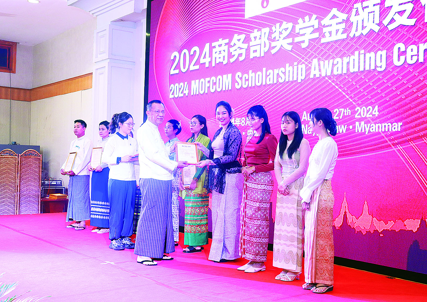 ထို့နောက် ပြည်ထောင်စုဝန်ကြီး၊ မြန်မာနိုင်ငံဆိုင်ရာ တရုတ်နိုင်ငံသံအမတ်ကြီးနှင့် တရုတ်နိုင်ငံသံရုံးမှ စီးပွားရေးနှင့်ကူးသန်းရောင်းဝယ်ရေးသံမှူးတို့က တရုတ်ပြည်သူ့သမ္မတနိုင်ငံရှိ တက္ကသိုလ်အသီးသီးမှ ကျောင်းဝင်ခွင့်လက်မှတ် (Admission Letter)များကို ပညာတော်သင်ဆု ရွေးချယ်ခြင်းခံရသည့် အရာထမ်း၊ အမှုထမ်းများကို ပေးအပ်ချီးမြှင့်ခဲ့ ကြပြီး MOFCOM ပညာတော်သင် ကျောင်းသားဟောင်း တစ်ဦးနှင့် ပညာတော်သင်ဆုရရှိသူ အရာထမ်းတစ်ဦးတို့က ကျေးဇူးတင် စကားပြန်လည်ပြောကြားသည်။