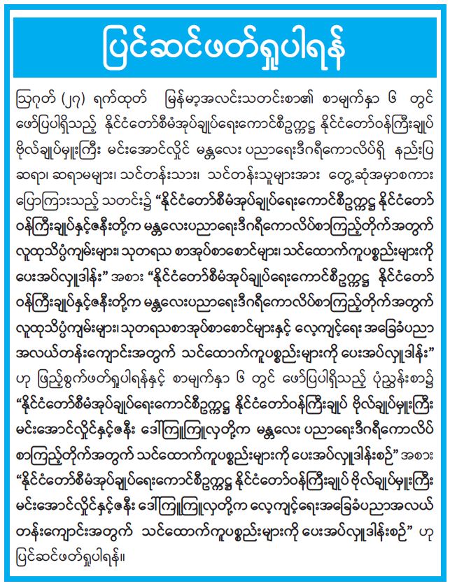 ဩဂုတ်(၂၇)ရက်ထုတ် မြန်မာ့အလင်းသတင်းစာ၏ စာမျက်နှာ ၆ တွင် ဖော်ပြပါရှိသည့် နိုင်ငံတော်စီမံအုပ်ချုပ်ရေးကောင်စီဥက္ကဋ္ဌ နိုင်ငံတော်ဝန်ကြီးချုပ် ဗိုလ်ချုပ်မှူးကြီးမင်းအောင်လှိုင် မန္တလေး ပညာရေးဒီဂရီကောလိပ်ရှိ နည်းပြ ဆရာ၊ ဆရာမများ၊ သင်တန်းသား၊ သင်တန်းသူများအား တွေ့ဆုံအမှာစကား ပြောကြားသည့် သတင်း၌ “နိုင်ငံတော်စီမံအုပ်ချုပ်ရေးကောင်စီဥက္ကဋ္ဌ နိုင်ငံတော်ဝန်ကြီးချုပ်နှင့်ဇနီးတို့က မန္တလေးပညာရေးဒီဂရီကောလိပ်စာကြည့်တိုက်အတွက် လူထုသိပ္ပံကျမ်းများ၊ သုတရသစာအုပ်စာစောင်များ၊ သင်ထောက်ကူပစ္စည်းများကို ပေးအပ်လှူဒါန်း” အစား “နိုင်ငံတော်စီမံအုပ်ချုပ်ရေးကောင်စီဥက္ကဋ္ဌ နိုင်ငံတော်ဝန်ကြီးချုပ်နှင့်ဇနီးတို့က မန္တလေးပညာရေးဒီဂရီကောလိပ်စာကြည့်တိုက်အတွက် လူထုသိပ္ပံကျမ်းများ၊ သုတရသစာအုပ်စာစောင်များနှင့် လေ့ကျင့်ရေးအခြေခံပညာအလယ်တန်းကျောင်းအတွက် သင်ထောက်ကူပစ္စည်းများကို ပေးအပ်လှူဒါန်း” ဟု ဖြည့်စွက်ဖတ်ရှုပါရန်နှင့် စာမျက်နှာ ၆ တွင် ဖော်ပြပါရှိသည့် ပုံညွှန်းစာ၌ “နိုင်ငံတော်စီမံအုပ်ချုပ်ရေးကောင်စီဥက္ကဋ္ဌ နိုင်ငံတော်ဝန်ကြီးချုပ် ဗိုလ်ချုပ်မှူးကြီး မင်းအောင်လှိုင်နှင့်ဇနီး ဒေါ်ကြူကြူလှတို့က မန္တလေးပညာရေးဒီဂရီကောလိပ် စာကြည့်တိုက်အတွက် သင်ထောက်ကူပစ္စည်းများကို ပေးအပ်လှူဒါန်းစဉ်” အစား “နိုင်ငံတော်စီမံအုပ်ချုပ်ရေးကောင်စီဥက္ကဋ္ဌ နိုင်ငံတော်ဝန်ကြီးချုပ် ဗိုလ်ချုပ်မှူးကြီး မင်းအောင်လှိုင်နှင့်ဇနီး ဒေါ်ကြူကြူလှတို့က လေ့ကျင့်ရေးအခြေခံပညာအလယ်တန်းကျောင်းအတွက် သင်ထောက်ကူပစ္စည်းများကို ပေးအပ်လှူဒါန်းစဉ်” ဟု ပြင်ဆင်ဖတ်ရှုပါရန်။