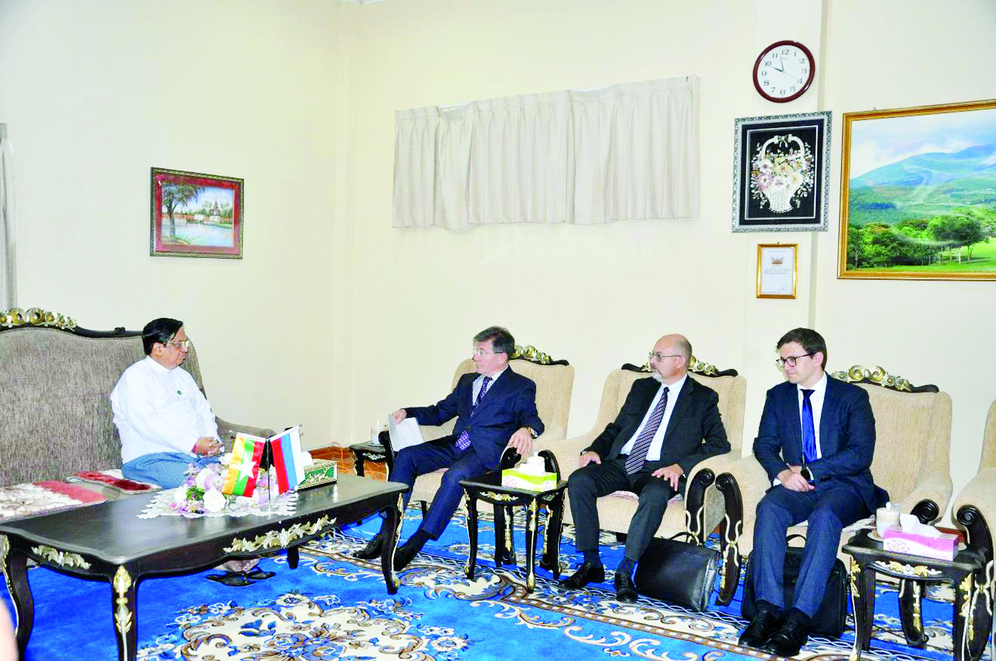 စက်မှုဝန်ကြီးဌာန ပြည်ထောင်စုဝန်ကြီး ဒေါက်တာချာလီသန်းသည် မြန်မာနိုင်ငံဆိုင်ရာ ရုရှားဖက်ဒရေးရှင်းနိုင်ငံ သံအမတ်ကြီး H.E. Mr. Iskander Azizov ဦးဆောင်သည့် ကိုယ်စားလှယ်အဖွဲ့ကို ယနေ့နံနက်ပိုင်းတွင် စက်မှုဝန်ကြီးဌာန ရုံးအမှတ်(၃၀)ရှိ ပြည်ထောင်စုဝန်ကြီး၏ ဧည့်ခန်းမ၌ လက်ခံတွေ့ဆုံသည်။