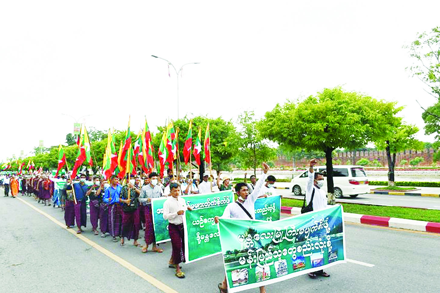 အဆိုပါဆန္ဒထုတ်ဖော်ပွဲသို့ မန္တလေးမြို့နှင့် အနီးပတ်ဝန်းကျင်များမှ သံဃာတော်များနှင့် မျိုးချစ်ဒေသခံပြည်သူများက မန္တလေးတောင်ခြေရှိ ခြင်္သေ့ကြီး နှစ်ကောင်ရှေ့တွင် စုရပ်ပြုလုပ်၍ ပြည်ကြီးတံခွန်မြို့နယ်၊ တံခွန်တိုင်အဝိုင်းသို့ စနစ်တကျ စီတန်းလှည့်လည်ချီတက်၍ ဆန္ဒထုတ်ဖော်ရာ လမ်းတစ်လျှောက်တွင် ယဉ်ကျေးမှုအမွေအနှစ်များတည်တံ့ဖို့ ဒို့မန္တလေးသားတွေ စောက်ရှောက်စို့၊ မန္တလေးမြို့ကြီး မပျက်စီးဖို့ မန်းပြည်သူတွေစည်းလုံးစို့၊ ရာဇဝင်ကောင်းတဲ့ ဒို့မန္တလေးဒို့မျိုးဆက်အတွက် ဆက်ထိန်းပေး၊ အကြမ်းဖက်မှုများ တိုက်ခိုက်ဖို့ မန်းပြည်သူတွေညီကြစို့၊ တိုင်းရင်းသားညီအကိုမောင်နှမများ စည်းလုံးညီညွှတ်ရေး ဒို့အရေး၊ မန္တလေးမြို့ကြီး တည်ငြိမ်အေးချမ်းရေးဒို့အရေး၊ ယဉ်ကျေးမှုအမွေအနှစ်များ ထိန်းသိမ်းစောက်ရှောက်ရေး ဒို့အရေး၊ အကြမ်းဖက်မှုမှန်သမျှ ဆန့်ကျင်ကြစသည့် ကြွေးကြော်သံများဖြင့် ကြွေးကြော်၍ ပိုစတာများ၊ ဆိုင်းဘုတ်များကိုင်ဆောင်ကာ ငြိမ်းချမ်းစွာ ဆန္ဒထုတ်ဖော်ခဲ့ကြကြောင်း သတင်းရရှိသည်။