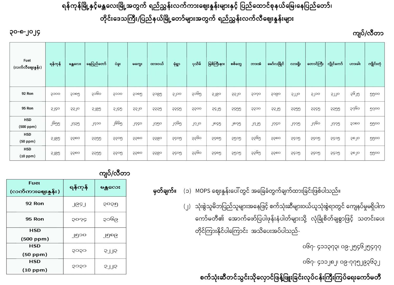 ရန်ကုန်မြို့နှင့် မန္တလေးမြို့အတွက် ရည်ညွှန်းလက်ကားဈေးနှုန်းများနှင့် ပြည်ထောင်စုနယ်မြေ နေပြည်တော်၊ တိုင်းဒေသကြီး/ပြည်နယ် မြို့တော်များအတွက် ရည်ညွှန်းလက်လီဈေးနှုန်းများ 08/30/2024