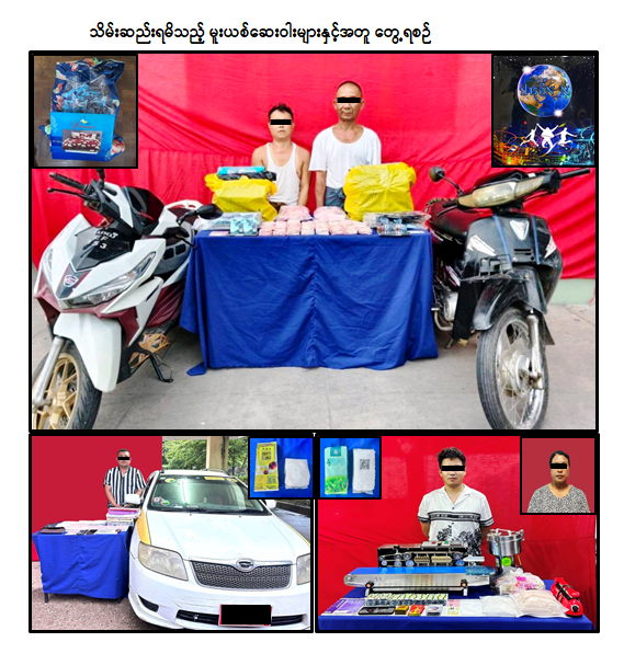 မူးယစ်ဆေးဝါးတားဆီးနှိမ်နင်းရေးရဲတပ်ဖွဲ့မှ တပ်ဖွဲ့ဝင်များပါဝင်သော ပူးပေါင်းအဖွဲ့သည် သတင်းအရ ဩဂုတ်လ ၂၇ ရက်နေ့ နံနက် ၉ နာရီအချိန် မန္တလေးတိုင်းဒေသကြီး၊ ပြည်ကြီးတံခွန်မြို့နယ်၊ ငွေတော်ကျီကုန်းရပ်ကွက်ရှိ ကားဂိတ်တွင် မော်တော်ဆိုင်ကယ်ဖြင့် ပါဆယ်ပစ္စည်းလာရောက် ထုတ်ယူသူ စိုးတင့်အား စစ်ဆေးရှာဖွေရာ ၎င်းထံမှ စိတ်ပြောင်းဆေးဝါး Happy Water ၂ ဒသမ ၄၅ ကီလို သိမ်းဆည်းရမိခဲ့ပြီး ၎င်း၏ဖော်ထုတ်ချက်အရ စိတ်ပြောင်းဆေးဝါးများ လက်ခံမည့်သူ စိုင်းခမ်းတီအား အောင်မြေသာစံမြို့နယ်၊ မဟာဇေယျာဘုံရပ်ကွက်တွင် မော်တော်ဆိုင်ကယ်တစ်စီးနှင့်အတူ ဖမ်းဆီးရမိခဲ့ကြောင်း၊ ကွင်းဆက်စစ်ဆေးဖော်ထုတ်ချက်အရ ရန်ကုန်တိုင်းဒေသကြီး၊ မင်္ဂလာဒုံမြို့နယ်၊ အောင်မင်္ဂလာအဝေးပြေးကားဝင်းတွင် ကံထူးတင်သိန်းအား စိတ်ပြောင်းဆေးဝါးများဖြစ်သည့် အက်တက်စီဆေးပြား ၄,၉၀၀ ပြား၊ Happy-5 ဆေးပြား ၃၈၀ ပြား၊ ကက်တမင်း ၉၅၀ ဂရမ်၊ TOYOTA FIELDER မော်တော်ယာဉ်တစ်စီးနှင့်အတူ ဆက်လက်ဖမ်းဆီးရမိခဲ့ပြီး ၎င်း၏ဖော်ထုတ်ချက်အရ စိတ်ပြောင်းဆေးဝါးများ ယူဆောင်ခိုင်းသူ အောင်ဘုန်းမြတ်အား တောင်ဥက္ကလာပမြို့နယ်၊ (၁၁) ရပ်ကွက်၊ မေတ္တာလမ်းရှိ ၎င်း၏နေအိမ်တွင် စိတ်ပြောင်းဆေးဝါးများဖြစ်သည့် အိုက်စ်(မက်သ်အဖက်တမင်း) ၄၇၀ ဂရမ်၊ ကက်တမင်း ၂၅ ဂရမ်၊ Collagen အမှုန့် ၁ ကီလိုနှင့် မူးယစ်ဆေးဝါး Tramadol ဆေးတောင့် ၇၀၀ တောင့်နှင့်လည်းကောင်း၊ ဩဂုတ်လ ၂၈ ရက်နေ့ နံနက် ၁၁ နာရီအချိန် စိတ်ပြောင်းဆေးဝါးများအား လူမဲ့တန်ဆာဖြင့် ပို့ဆောင်ပေးသူ မဝါဝါလွင်(ခ)စန္ဒာအား ရပ်စောက်မြို့နယ်၊ ပင်ဖြစ်ကျေးရွာ၊ ရပ်ကွက်(၁)တွင် ထပ်မံဖမ်းဆီးရမိခဲ့သဖြင့် စုစုပေါင်း ဒေသကာလတန်ဖိုးငွေကျပ် သိန်း ၅,၅၀၀ ကျော် တန်ဖိုးရှိ စိတ်ပြောင်းဆေးဝါးများဖြစ်သည့် Happy Water ၂ ဒသမ ၄၅ ကီလို၊ အက်တက်စီဆေးပြား ၄,၉၀၀ ပြား၊ Happy-5 ဆေးပြား ၃၈၀ ပြား၊ ကက်တမင်း ၉၅၀ ဂရမ်၊ အိုက်စ်(မက်သ်အဖက်တမင်း) ၄၇၀ ဂရမ်၊ ကက်တမင်း ၂၅ ဂရမ်၊ Collagen အမှုန့် ၁ ကီလိုနှင့် မူးယစ်ဆေးဝါး Tramadol ဆေးတောင့် ၇၀၀ တောင့် သိမ်းဆည်းရမိခဲ့ကြောင်း၊ စစ်ဆေးဖော်ထုတ်ချက်များအရ သိမ်းဆည်းရမိမူးယစ်ဆေးဝါးများအား ရှမ်းပြည်နယ်မှ မန္တလေးတိုင်းဒေသကြီးနှင့် ရန်ကုန်တိုင်းဒေသကြီးတို့သို့ သယ်ဆောင်၍ KTV/ CLUB/ BAR နှင့် စားသောက်ဆိုင်များတွင် လူငယ်များအား ဖြန့်ဖြူးရောင်းချခြင်းဖြစ်ကြောင်း သိရှိရသဖြင့် ၎င်းတို့အား ဥပဒေအရအရေးယူထားရှိပြီး ကွင်းဆက်ပြစ်မှုကျူးလွန်သူများအား ဆက်လက်စစ်ဆေးဖော်ထုတ်လျက်ရှိကြောင်း သတင်းရရှိသည်။