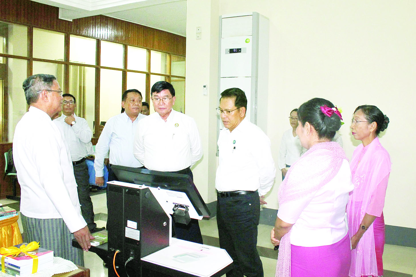ဦးစွာ ပြည်ထောင်စုဝန်ကြီးနှင့် တိုင်းဒေသကြီး ဝန်ကြီးချုပ်တို့သည် မကွေးတက္ကသိုလ်စာကြည့်တိုက်သို့ ရောက်ရှိရာ စာကြည့်တိုက်တာဝန်ခံက အီလက်ထရောနစ်စနစ်ဖြင့် စာပြုလုပ်ငန်း၊ စာငှားလုပ်ငန်းများ ဆောင်ရွက်ထားရှိမှုအခြေအနေများကို ရှင်းလင်းတင်ပြသည်။