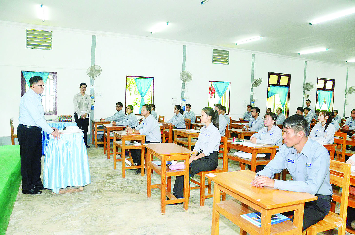 တွေ့ဆုံစဉ် ဒုတိယဝန်ကြီးကသင်တန်းများတွင် တိရစ္ဆာန်ရောဂါ ကာကွယ်ကုသရေးဆိုင်ရာအတတ်ပညာကို ကျွမ်းဝင်နားလည်သည့် ပညာရှင်ဝန်ထမ်းများအဖြစ် လေ့ကျင့်မွေးထုတ်ပေးပြီး စိုက်ပျိုးမွေးမြူရေးကိုအခြေခံသည့် ကျေးလက်ဒေသများ၏ လူမှုစီးပွားဘဝမြှင့်တင်ရေးလုပ်ငန်းများ ဆောင်ရွက်ရာ၌ မွေးမြူရေးကဏ္ဍဖြင့် ထိထိရောက်ရောက် ဆောင်ရွက်ပေးနိုင်ရန် လေ့ကျင့်ပျိုးထောင်ပေးခြင်း ဖြစ်ပါကြောင်း၊ ဒေသအသီးသီးမှ လာရောက်သင်ယူလေ့လာကြသော သင်တန်းသား သင်တန်းသူများအနေဖြင့် စွမ်းဆောင်ရည်ပြည့်ဝသော လူ့စွမ်းအားအရင်းအမြစ်များအဖြစ် မွေးမြူရေးကဏ္ဍအတွက် ခေါင်းဆောင်ကောင်းများ ဖြစ်လာစေရေး ကြိုးပမ်းအားထုတ်ကြစေလိုကြောင်း ဆွေးနွေးမှာကြားပြီး သင်တန်းသား သင်တန်းသူများအတွက် အာဟာရဖြည့်စွက်စာနှင့် ကြက်ဥများကိုပေးအပ်သည်။