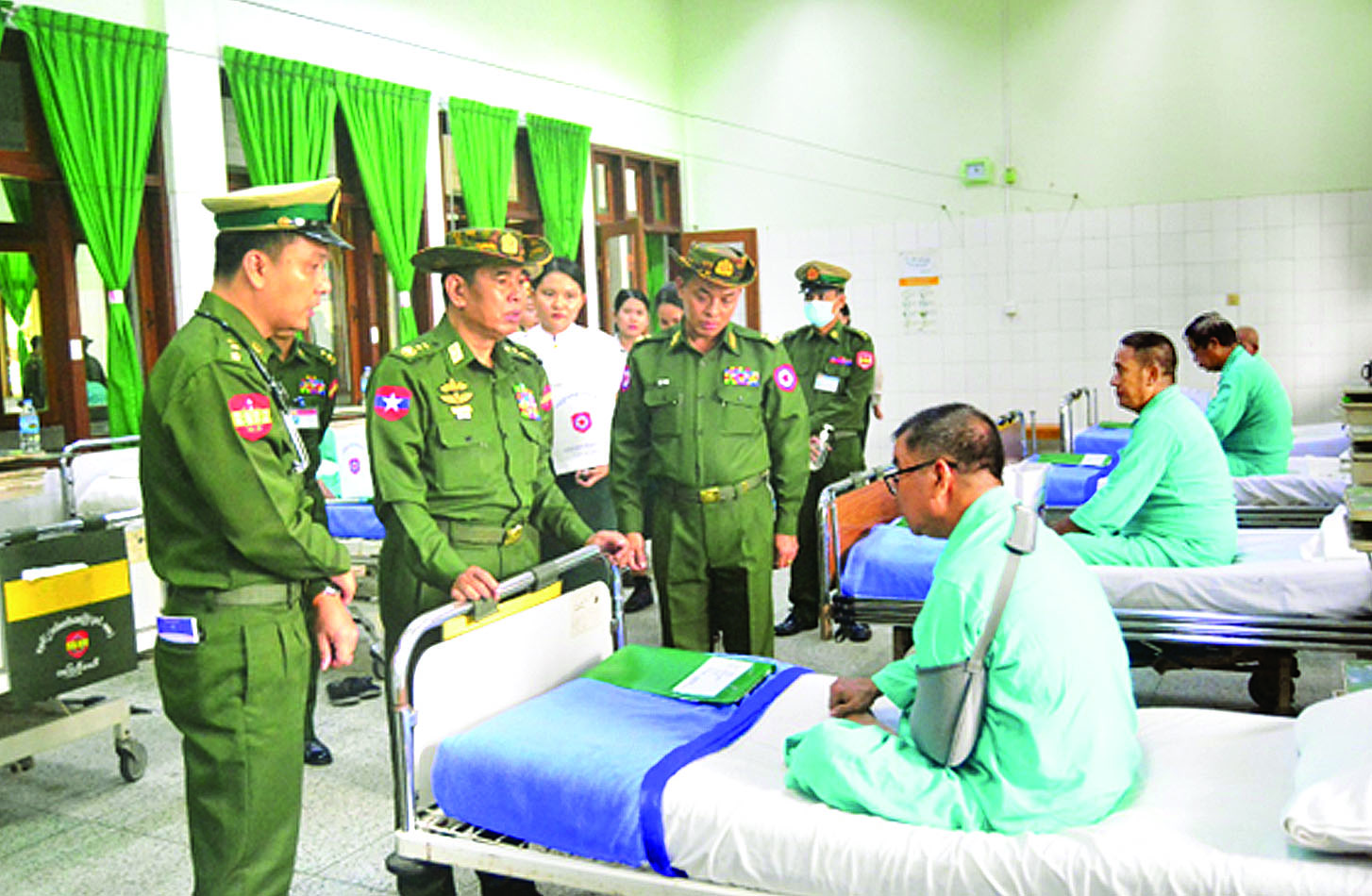 အလားတူ ရှမ်းပြည်နယ် (တောင်ပိုင်း) ခိုလမ်မြို့ရှိ နယ်မြေခံဆေးတပ်ရင်း၊ ရန်ကုန်တိုင်းဒေသကြီး မင်္ဂလာဒုံမြို့နယ်ရှိ တပ်မတော်အရိုးရောဂါ အထူးကုဆေးရုံကြီး (ခုတင်-၅၀၀) နှင့် တပ်မတော်ဆေးရုံကြီး (ခုတင် - ၁၀၀၀)၊ သန်လျင်မြို့နယ်ရှိ နယ်မြေခံတပ်မတော်ဆေးရုံတို့၌ တက်ရောက်ကုသမှု ခံယူလျက်ရှိသော အရာရှိ၊ စစ်သည်၊ မိသားစုများ၊ စစ်မှုထမ်းဟောင်းအဖွဲ့ဝင်များနှင့် မိသားစုဝင်များ၊ ပြည်သူ့စစ် (ဌာနေ) တပ်ဖွဲ့ဝင်များနှင့် ဒေသခံပြည်သူများကို ယနေ့နံနက်ပိုင်းတွင် သက်ဆိုင်ရာတိုင်းစစ်ဌာနချုပ်များမှ တိုင်းမှူးများနှင့် တာဝန်ရှိသူများကသွားရောက်ကြည့်ရှု၍ တစ်ဦးချင်း၏ရောဂါဖြစ်ပွားမှု၊ ဆေးဝါးကုသပေးထားမှုနှင့် ကျန်းမာရေးတိုးတက်ကောင်းမွန်မှုအခြေအနေများကို ရင်းရင်းနှီးနှီး မေးမြန်းအားပေးစကားပြောကြားပြီး စားသောက်ဖွယ်ရာများပေးအပ်သည်။ ထို့နောက် တိုင်းမှူးများနှင့် တာဝန်ရှိသူများသည် ဆေးရုံများအတွင်း လှည့်လည်ကြည့်ရှု၍ လိုအပ်သည်များညှိနှိုင်းဆောင်ရွက်ပေးခဲ့ကြောင်း သတင်းရရှိသည်။