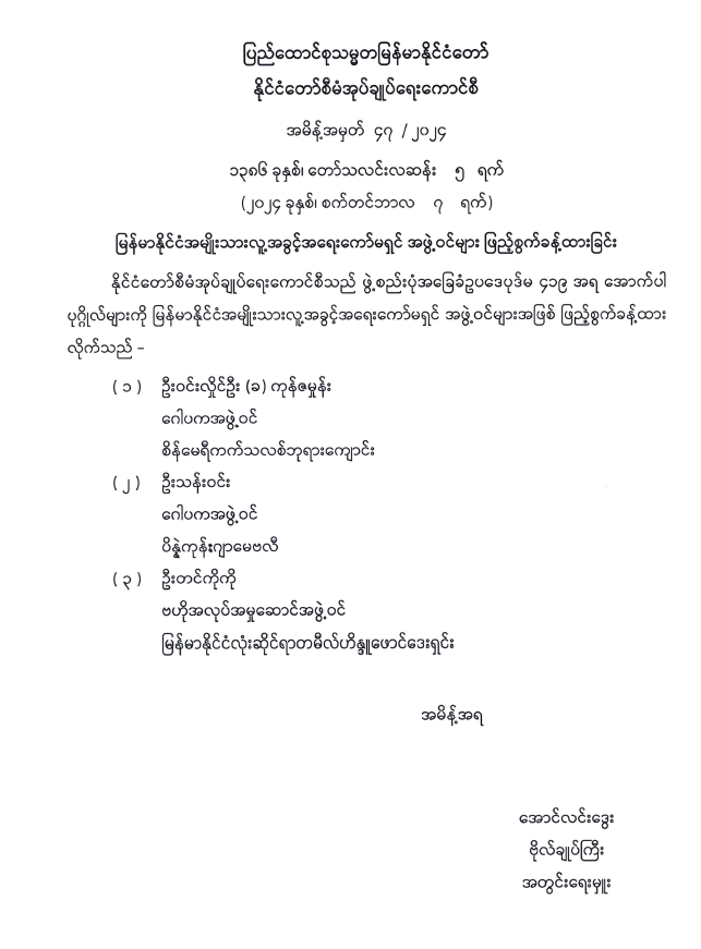 မြန်မာနိုင်ငံအမျိုးသားလူ့အခွင့်အရေးကော်မရှင် အဖွဲ့ဝင်များ ဖြည့်စွက်ခန့်ထားခြင်း