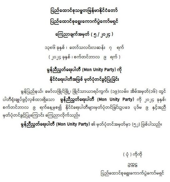 မွန်ညီညွတ်ရေးပါတီ (Mon Unity Party) ကို နိုင်ငံရေးပါတီအဖြစ် မှတ်ပုံတင်ခွင့်ပြုခြင်း