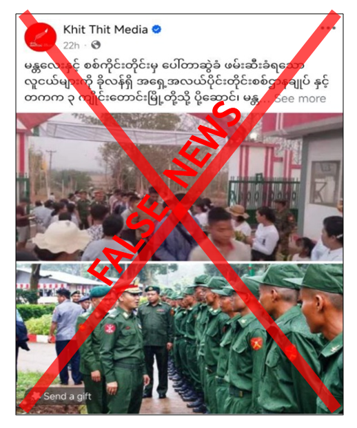 စစ်ကိုင်းမြို့နှင့် မန္တလေးမြို့တို့၌ စစ်မှုထမ်းဆောင်ရန်အတွက် ဖမ်းဆီးခံရသော လူငယ်များကို ခိုလန်နှင့် နမ့်စန်မြို့များသို့ ပို့ဆောင်လျက်ရှိကြောင်း သတင်းတု၊ သတင်းအမှားအား တရားမဝင် ပြည်ဖျက်မီဒီယာများက လုပ်ကြံရေးသားဖြန့်ဝေနေသည်ကို တွေ့ရှိရသည်။