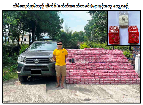 လုံခြုံရေးတပ်ဖွဲ့ဝင်များပါဝင်သော ပူးပေါင်းအဖွဲ့သည် စက်တင်ဘာလ ၇ ရက်နေ့ နံနက် ၄ နာရီခွဲအချိန် ရှမ်းပြည်နယ် (အရှေ့ပိုင်း) ၊ ကျိုင်းတုံမြို့နယ်၊ ယန်းကျိန်ကျေးရွာအနီး၊ မိုင်းလား- ကျိုင်းတုံသွားကားလမ်းတွင် လော်တားမောင်းနှင်လာသည့် TOYOTA HILUX REVO မော်တော်ယာဉ်ကို သတင်းအရရှာဖွေရာ ယာဉ်ပေါ်မှ ဒေသကာလတန်ဖိုးငွေကျပ် ၈ ဒသမ ၃၇ ဘီလီယံကျော်တန်ဖိုးရှိ အိုက်စ်(မက်သ်အဖက်တမင်း) ၁ ဒသမ ၀၄၇ တန် သိမ်းဆည်းရမိခဲ့ပြီး စစ်ဆေးဖော်ထုတ်ချက်အရ သိမ်းဆည်းရမိ အိုက်စ် (မက်သ်အဖက်တမင်း) များအား ကျိုင်းတုံမြို့နယ်မှ မိုင်းဖြတ်မြို့နယ်သို့ သယ်ဆောင် ရောင်းဝယ်ခြင်းဖြစ်ကြောင်းသိရှိရသဖြင့် ၎င်းအား ဥပဒေအရအရေးယူထားရှိပြီး ကွင်းဆက်ပြစ်မှုကျူးလွန်သူများအား စစ်ဆေးဖော်ထုတ်လျက်ရှိကြောင်း မြန်မာနိုင်ငံရဲတပ်ဖွဲ့မှ သတင်းရရှိသည်။