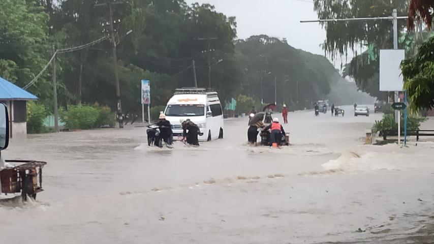 မိုးအဆက်မပြတ် ရွာသွန်းမှုကြောင့် မြို့တွင်းဗိုလ်ချုပ်ကြေးရုပ်ရှေ့ ရန်ကုန်-မန္တလေး ကားလမ်းဟောင်းပေါ် ရေကျော်ခြင်း၊ မြို့ပေါ်ရပ်ကွက်ကြီး ရွှေစည်းခုံရပ်ကွက်၊ ဗမကကျောင်းတိုက်စုရပ်ကွက်၊ ရွှေပြည်သာရပ်ကွက်၊ ဝါတိုးရပ်ကွက်၊ ကြည်တော်ကုန်းရပ်ကွက်နှင့် ကျေးရွာများအတွင်း ရေဝင်ရောက်ခြင်းများ ဖြစ်ပေါ်လျက်ရှိကြောင်းနှင့် အထက-၁ ကျောင်း အရှေ့ဘက် အုတ်တံတိုင်း ၃ ခန်း ပြိုကျသွားကြောင်း သိရသည်။