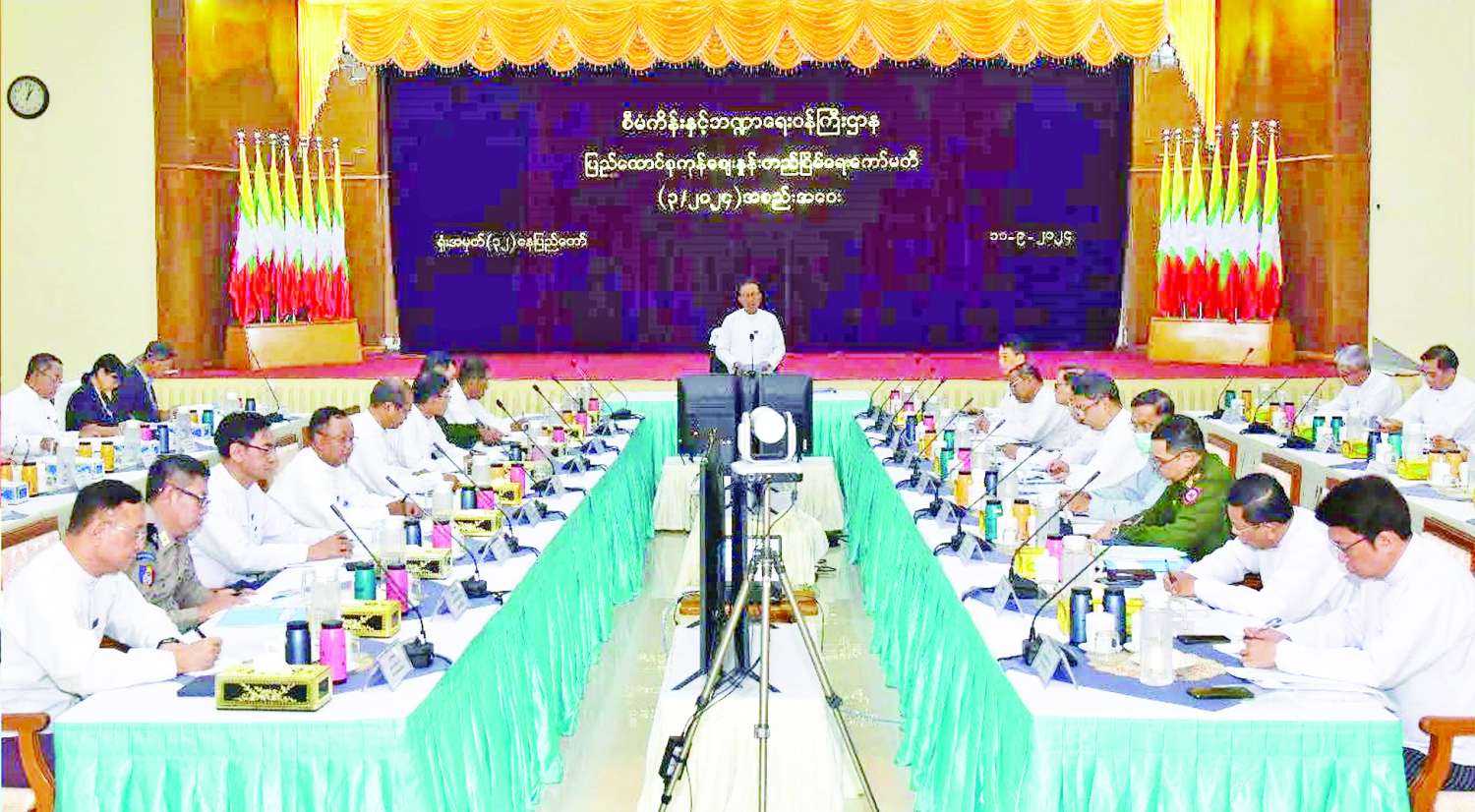 ယနေ့အစည်းအဝေးတွင် တိုင်းဒေသကြီးနှင့် ပြည်နယ်ဝန်ကြီးချုပ်များအနေဖြင့် အဓိကစားသောက်ကုန်ဖြစ်သည့် ဆန်၊ စားသုံးဆီအပါအဝင် အခြေခံစားသောက်ကုန်များ၊ ဆေးနှင့် ဆေးပစ္စည်းများ၊ စက်သုံးဆီစသည့် အရေးကြီးကုန်စည်များ ပြတ်လပ်မှုမရှိစေရေး၊ ကုန်ဈေးနှုန်း တည်ငြိမ်ရေးနှင့်စပ်လျဉ်း၍ နေ့စဉ်ကြပ်မတ်ဆောင်ရွက်လျက်ရှိသည့် အခြေအနေ၊ တွေ့ကြုံရသည့် အခက်အခဲ၊ ဆောင်ရွက်သင့်သည့် ကိစ္စရပ်များကို ဆွေးနွေးတင်ပြပေးရန် တိုက်တွန်းပြောကြားသည်။