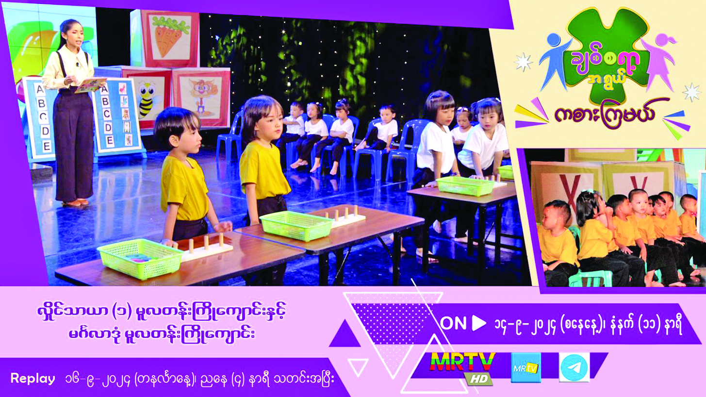 “ချစ်စရာ့အရွယ်ကစားကြမယ်” ကလေးအစီအစဉ်ကို MRTV- HD Channel မှ အပတ်စဉ် စနေနေ့တိုင်း ထုတ်လွှင့်ပြသလျက်ရှိရာ စက်တင်ဘာ ၁၄ ရက် (စနေနေ့) နံနက် ၁၁ နာရီတွင် လှိုင်သာယာ (၁) မူလတန်းကြိုကျောင်းနှင့် မင်္ဂလာဒုံမူလတန်းကြိုကျောင်းတို့မှ ကလေးငယ်များ ပါဝင်ကစားကြပုံများကို မြန်မာ့အသံနှင့်ရုပ်မြင်သံကြား၏ MRTV-HD Channel မှ ဆက်လက်ထုတ်လွှင့်ပြသမည်ဖြစ်သည်။