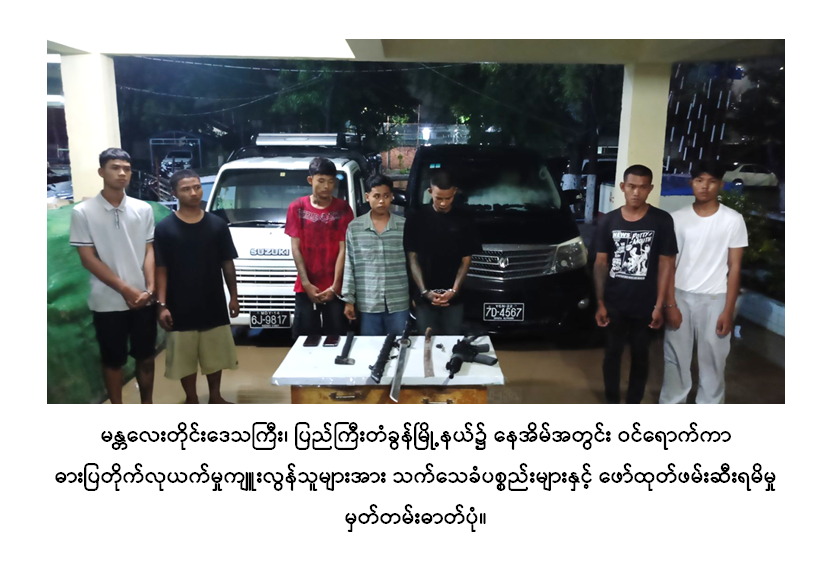 အထက်ပါဖြစ်စဉ်မှ ပြစ်မှုကျုးလွန်သူများအား ဖော်ထုတ်ဖမ်းဆီးနိုင်ရေးအတွက် လုံခြုံရေးတပ်ဖွဲ့ဝင်များက အထူးအမှုစစ်အဖွဲ့ဖြင့် အခင်းဖြစ်ရပ်မှတ်တမ်းအထောက်အထားများရယူ၍ နယ်မြေအတွင်း သတင်းရယူစုံစမ်းခြင်း၊ လုံခြုံရေးဆိုင်ရာအထောက်အကူပြုပစ္စည်းများမှ သတင်းအချက်အလက်များရယူစုံစမ်းဖော်ထုတ်ခဲ့ရာ ည ၁၀ နာရီ ၄၅ မိနစ်တွင် ပြည်ကြီးတံခွန်မြို့နယ်၊ ငွေတော်ကျီကုန်းရပ်ကွက်၊ ၆၈ (D) လမ်းနှင့် မင်္ဂလာလမ်းထောင့်၌ ပြစ်မှုကျူးလွန်သူ တရားခံများဖြစ်ကြသည့် ချမ်းမြသာစည်မြို့နယ်၊ ထွန်တုံးရပ်ကွက်နေ ဇွဲထက် (ခ) ဇောင်းထက် (၂၆) နှစ် (ဘ) ဦးရဲဝင်း၊ တစ်ရပ်ကွက်တည်းနေ ချမ်းငြိမ်းသူ (၂၅) နှစ် (ဘ) ဦးမြင့်သန်း၊ ချမ်းမြသာစည်မြို့နယ်၊ မြရည်နန္ဒာရပ်ကွက်နေ ဟိန်းသန့် (၁၉) နှစ် (ဘ) ဦးကျော်မင်းထွန်း၊ တစ်ရပ်ကွက်တည်းနေ ဇင်မင်းခန့် (ခ) တရုတ်ကြီး (၁၉) နှစ် (ဘ) ဦးမိုးခိုင်၊ အောင်မြင့်မြတ် (ခ) ဆုပင် (၁၈) နှစ် (ဘ) ဦးအောင်ကျော်ကျော်မျိုး၊ အောင်မြင့်မြတ် (ခ) အောင်ဆန်းဦး (၁၉) နှစ် (ဘ) ဦးဝေလင်းအောင်၊ အောင်မြေသာစံမြို့နယ်၊ အိုးဘိုရပ်ကွက်နေ စိုင်းခွန်ကျော်ဇော (ခ) ခွန်ကျော် (၃၀) နှစ် (ဘ) ဦးမောင်မောင်ဆွေတို့ ၇ ဦးအား ပြစ်မှုကျူးလွန်ရာတွင် အသုံးပြုခဲ့သည့် အရိုး/အသွား ၂၄ လက်မခန့်ရှိ ဓားရှည် ၁ ချောင်း၊ အရိုး/ အသွား ၃၄ လက်မခန့်ရှိ ဓားရှည် ၁ ချောင်း၊ အရှည် ၆ လက်မခန့်ရှိ ရဲဒင်း ၁ လက်၊ ပလတ်စတစ်ဖြင့် ပြုလုပ်ထားသည့် ကော်သေနတ်အနက်ရောင် ၁ လက်၊ YGN-22/ 7D-4547 Alphard အမျိုးအစားအနက်ရောင်ယာဉ်၊ MDY-14/6J-9817 SUZUKI အမျိုးအစားယာဉ် ၂ စီးတို့နှင့်အတူ ဖမ်းဆီးရမိခဲ့သည်။