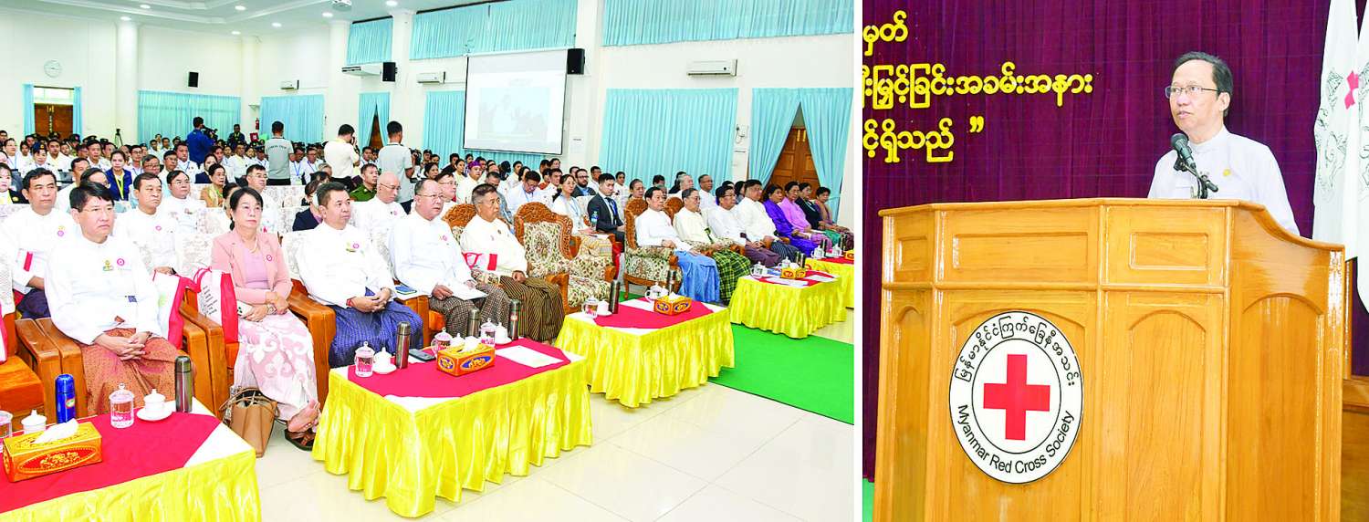 အခမ်းအနားတွင် ပြည်ထောင်စုဝန်ကြီးက မြန်မာနိုင်ငံကြက်ခြေနီအသင်းအနေဖြင့် အကြောင်းအမျိုးမျိုးကြောင့် ထိခိုက်ဒဏ်ရာရရှိသူများကို လူသားချင်းစာနာစိတ်အပြည့်ဖြင့် ရှေးဦးပြုစုခြင်းဆိုင်ရာလုပ်ငန်းများကို ဆောင်ရွက်ပေးရုံသာမက နိုင်ငံအတွင်း လူမှုကရုဏာဆိုင်ရာ အကူအညီ လိုအပ်သူများအတွက် အကူအညီများပေးခြင်း၊ သဘာဝဘေးအန္တရာယ် အမျိုးမျိုးတွင် ကူညီဆောင်ရွက်ပေးခြင်း၊ ကျန်းမာရေးစောင့်ရှောက်မှုလုပ်ငန်းများဆောင်ရွက်ခြင်း၊ စေတနာ သွေးလှူရှင်လုပ်ငန်းများနှင့် အရေးပေါ်လူနာတင်ယာဉ်လုပ်ငန်းများ ဆောင်ရွက်ပေးခြင်းအပြင် ကိုဗစ်- ၁၉ ရောဂါ ကာကွယ်တားဆီးရေးလုပ်ငန်းများ၊ မိုခါမုန်တိုင်းကြိုတင် ပြင်ဆင်တုံ့ပြန်ခြင်း လုပ်ငန်းများတွင်လည်း ပြည်သူလူထုအတွက် စွမ်းစွမ်းတမံအသက်စွန့်ပြီး ဆောင်ရွက်ပေးလျက်ရှိကြောင်း။