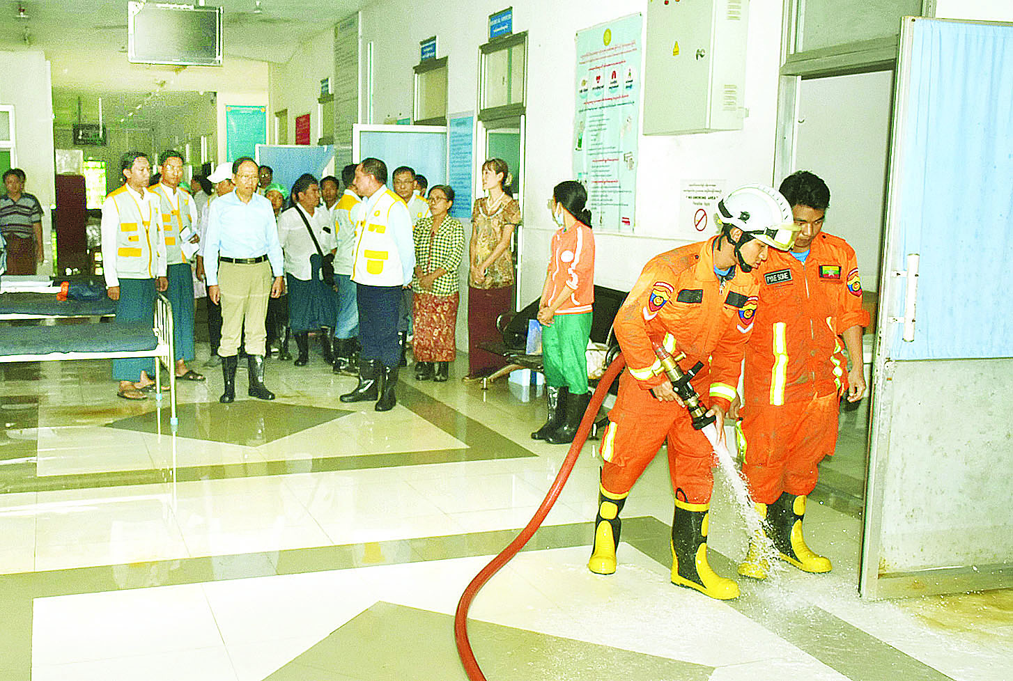 ဦးစွာ ပြည်ထောင်စုဝန်ကြီးနှင့်အဖွဲ့သည် ပြည်သူ့ဆေးရုံ(တပ်ကုန်းမြို့)သို့ ရောက်ရှိပြီး ကျန်းမာရေး ဝန်ထမ်းများနှင့် မီးသတ်တပ်ဖွဲ့ဝင်များပူးပေါင်းကာ ဆေးရုံအတွင်း သန့်ရှင်းရေး ဆောင်ရွက်နေမှု၊ ပြည်သူ့ဆေးရုံ၌ ပြင်ပလူနာဌာနသို့ လာရောက်ပြသသောလူနာများအား ကျန်းမာရေးစောင့်ရှောက်ပေးနေမှု၊ ရေဝင်ရောက်ခဲ့သော လူနာဆောင်များ၊ ခွဲစိတ်ခန်းများနှင့် ဆေးရုံသုံးစက်ပစ္စည်းများအခြေအနေကို ကြည့်ရှုစစ်ဆေးပြီး ရေမီးအမြန်ဆုံးပြန်လည်ရရှိ၍ ဆေးရုံလုပ်ငန်းများ ပုံမှန်အတိုင်း ပြန်လည်လည်ပတ်နိုင်ရေး ဆွေးနွေးမှာကြား၍ လိုအပ်သည်များကို ဖြည့်ဆည်းပေးကာ ကျန်းမာရေးဝန်ထမ်းများနှင့် မီးသတ်တပ်ဖွဲ့ဝင်များအား ချီးမြှင့်ထောက်ပံ့ငွေများ ပေးအပ်လှူဒါန်းသည်။