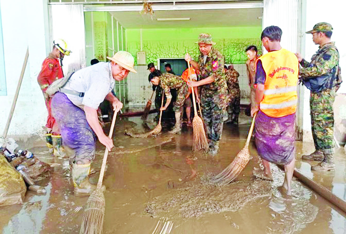 ယနေ့တွင်လည်း ရေကြီးရေလျှံမှုဖြစ်ပေါ်နေသည့် လယ်ဝေးမြို့နယ်၊ ပုဗ္ဗသီရိမြို့နယ်နှင့် ဇေယျာသီရိမြို့နယ်၊ ရှမ်းပြည်နယ် (အရှေ့ပိုင်း) တာချီလိတ်မြို့နယ်၊ မန္တလေးတိုင်းဒေသကြီး သာစည်မြို့နယ်နှင့် ပဲခူးတိုင်းဒေသကြီး တောင်ငူမြို့နယ်၊ ရေတာရှည်မြို့နယ်နှင့် အုတ်တွင်းမြို့နယ်များအတွင်းရှိ ရပ်ကွက်၊ ကျေးရွာများမှ ရေဘေးသင့်ပြည်သူများအား တပ်မတော်သားများ၊ မြန်မာနိုင်ငံရဲတပ်ဖွဲ့ဝင်များ၊ မီးသတ်တပ်ဖွဲ့ဝင်များ၊ ကြက်ခြေနီတပ်ဖွဲ့ဝင်များနှင့် လူမှုဝန်ထမ်းကယ်ဆယ်ရေးအဖွဲ့များက ကူညီကယ်ဆယ် ရွှေ့ပြောင်းပေးခြင်းလုပ်ငန်းများ ဆောင်ရွက်ပေးခြင်းနှင့် ရေများပြန်လည် ကျဆင်းသွားသည့်နေရာများရှိ လမ်း၊ တံတားများ၊ ရပ်ကွက်၊ ကျေးရွာများအတွင်း၌ တင်ကျန်ခဲ့သည့် နုန်းများ၊ သစ်ပင်သစ်ကိုင်းများဖယ်ရှားပေးခြင်းအပါအဝင် သန့်ရှင်းရေးလုပ်ငန်းများကို ဒေသခံပြည်သူများနှင့်ပူးပေါင်း၍ တက်ကြွစွာဆောင်ရွက်ပေးလျက်ရှိသည်။