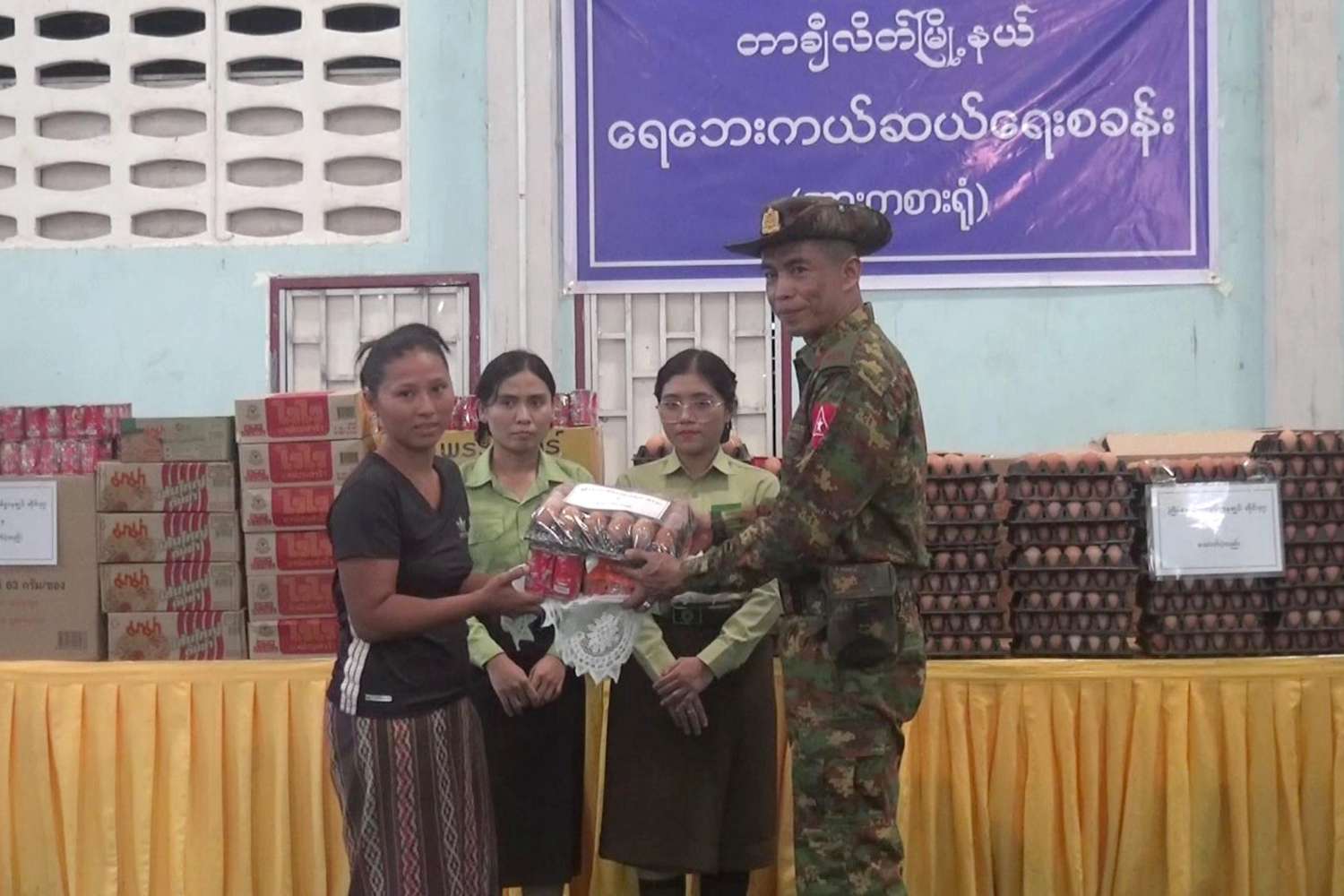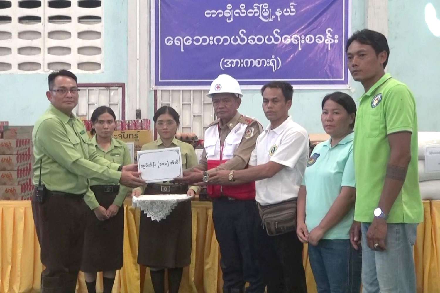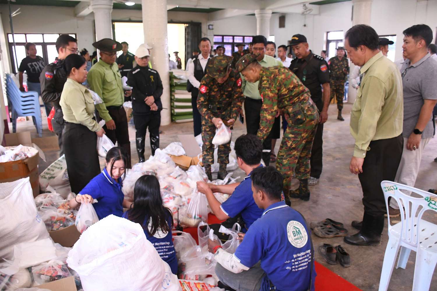 အဆိုပါရေဘေးသင့်ပြည်သူများအား တြိဂံဒေသတိုင်းစစ်ဌာနချုပ်တိုင်းမှူး ဗိုလ်ချုပ်စိုးလှိုင်နှင့် အဖွဲ့ဝင်များက တာချီလိတ်မြို့၊ မာကာဟိုခမ်းရပ်ကွက်၊ အားကစားရုံသို့ သွားရောက်တွေ့ဆုံအားပေးစကားပြောကြားပြီး ရေးဘေးသင့်ပြည်သူများအတွက် တြိဂံဒေသတိုင်းစစ်ဌာနချုပ်တိုင်းမှူးမှ ဆန်အိတ်ကြီး ၁၀ လုံး၊ ကြက်ဥ ၂၀၀၀ လုံး၊ ငါးသေတ္တာ ၆ လုံးပါ ၁၀၀ ကဒ်၊ ခေါက်ဆွဲ ခြောက် ၅၀ ဖာနှင့် ရှမ်းပြည်နယ်အစိုးရအဖွဲ့မှ ငွေကျပ် သိန်း ၁၀၀၊ တာချီလိတ်မြို့မီးလင်းရေး ကော်မတီမှ ထိုင်းဘတ်ငွေ ၁၀ သိန်း၊ မြသဟာဆေးရုံမှ ထိုင်းဘတ်ငွေ ၁ သိန်းတို့အား ထောက်ပံ့ပေးအပ်လှူဒါန်းခဲ့ကြောင်း သိရသည်။
