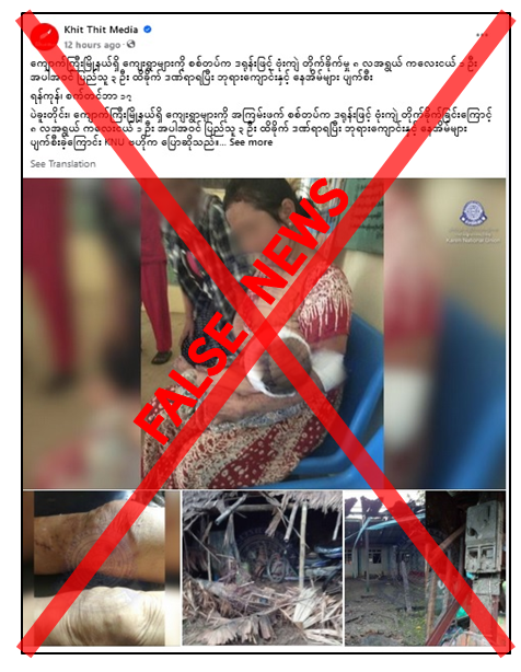 ပဲခူးတိုင်းဒေသကြီး၊ ကျောက်ကြီးမြို့နယ်ရှိ ကျေးရွာများကို တပ်မတော်က ဒရုန်းဖြင့် ဗုံးကြဲတိုက်ခိုက်ခြင်းကြောင့် ၈ လအရွယ် ကလေးငယ် ၁ ဦး အပါအဝင် ပြည်သူ ၃ ဦး ထိခိုက်ဒဏ်ရာရရှိပြီး ဘုရားကျောင်းနှင့်နေအိမ်များပျက်စီးခဲ့ကြောင်း တရားမဝင် ပြည်ဖျက်မီဒီယာများမှ သတင်းမှားများ မဟုတ်မမှန်ရေးသားဖြန့်ဝေလျက်ရှိကြောင်း တွေ့ရှိရသည်။